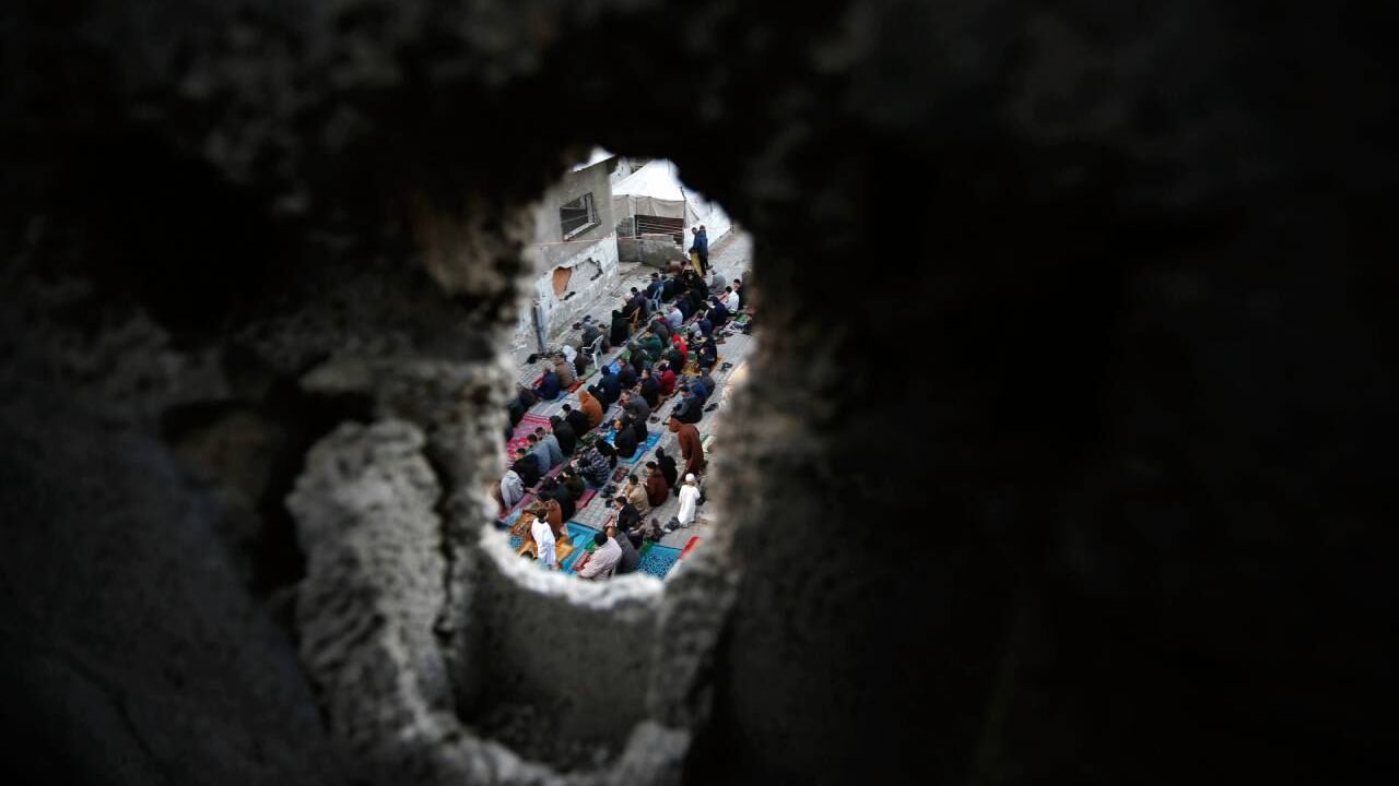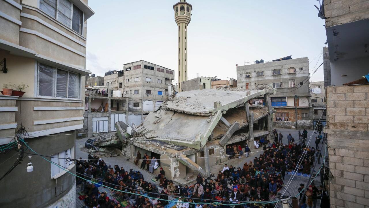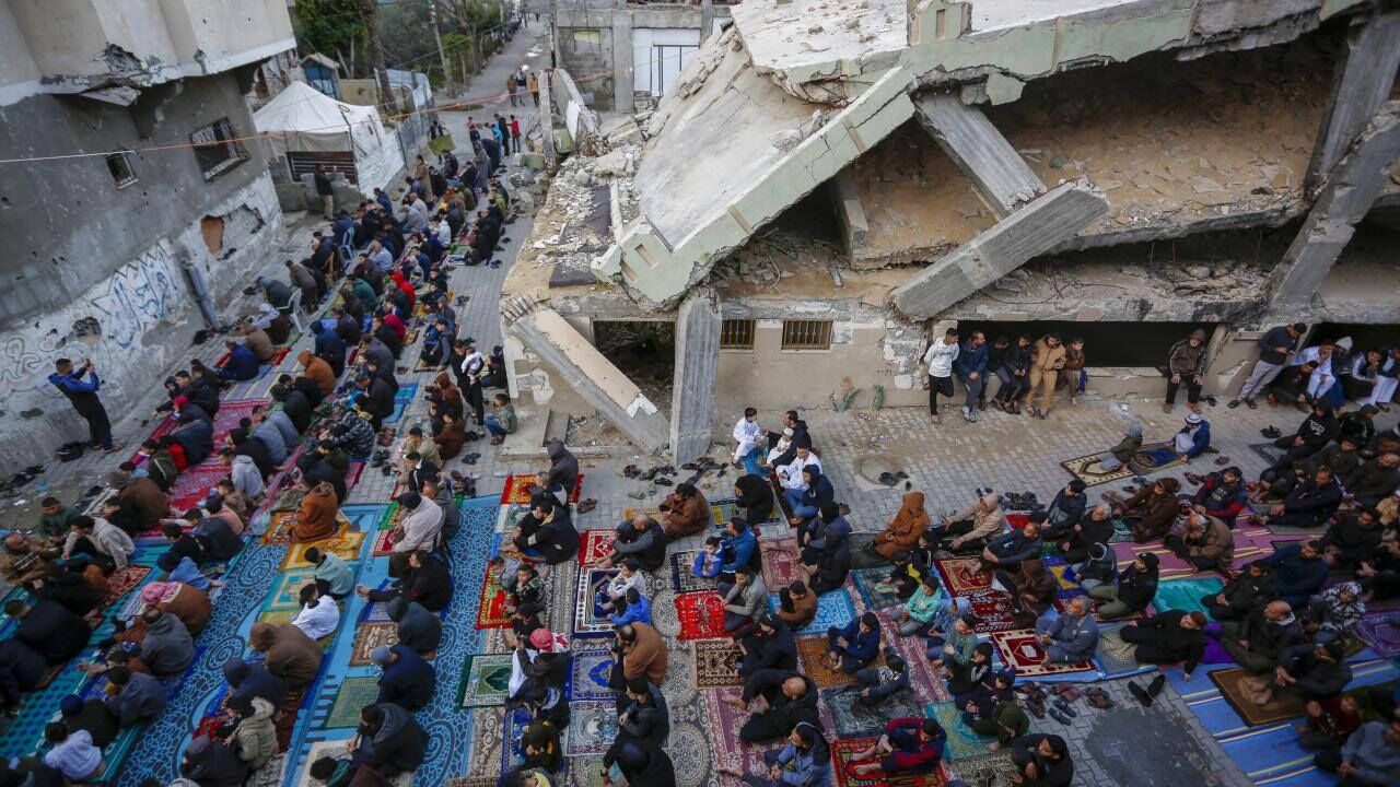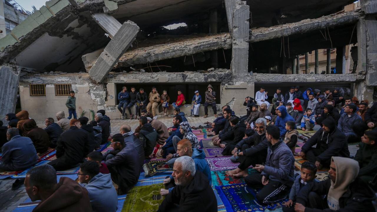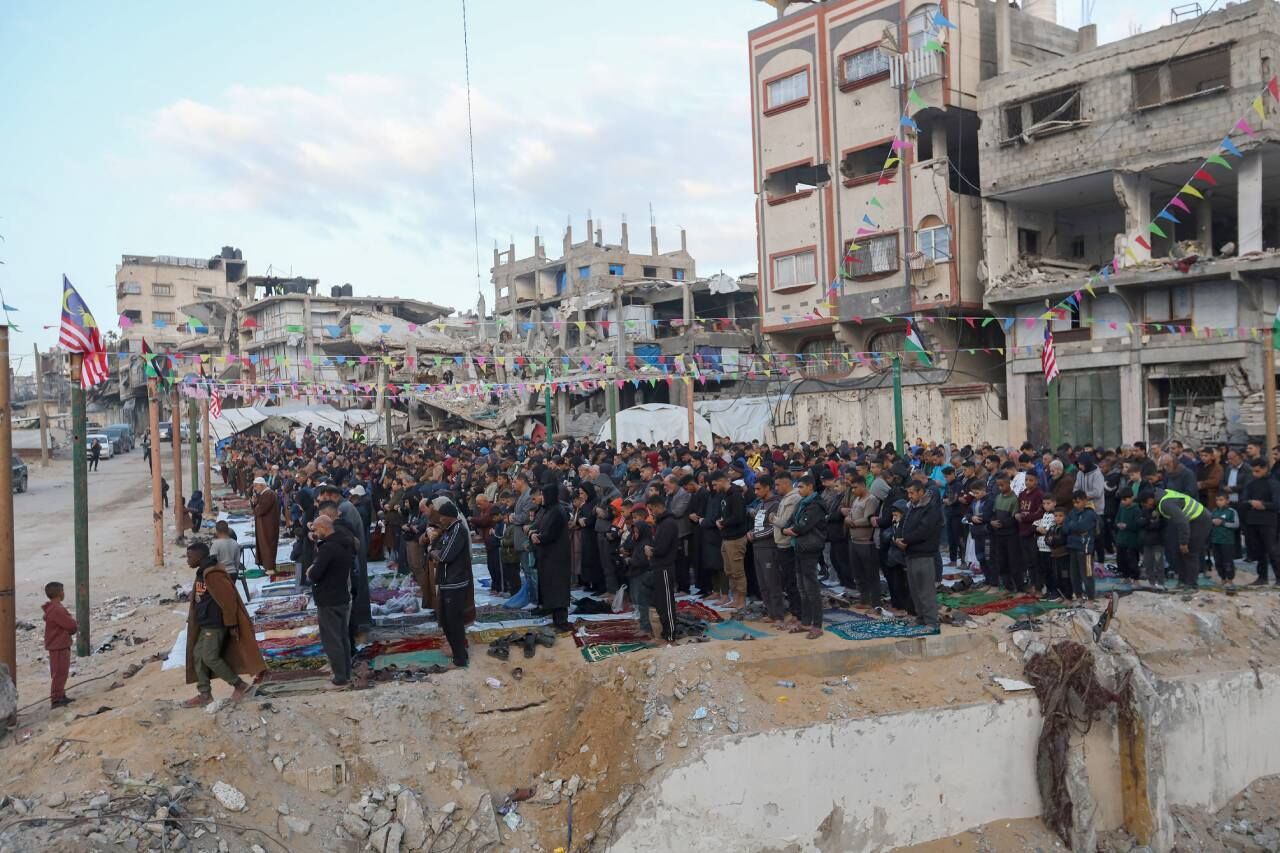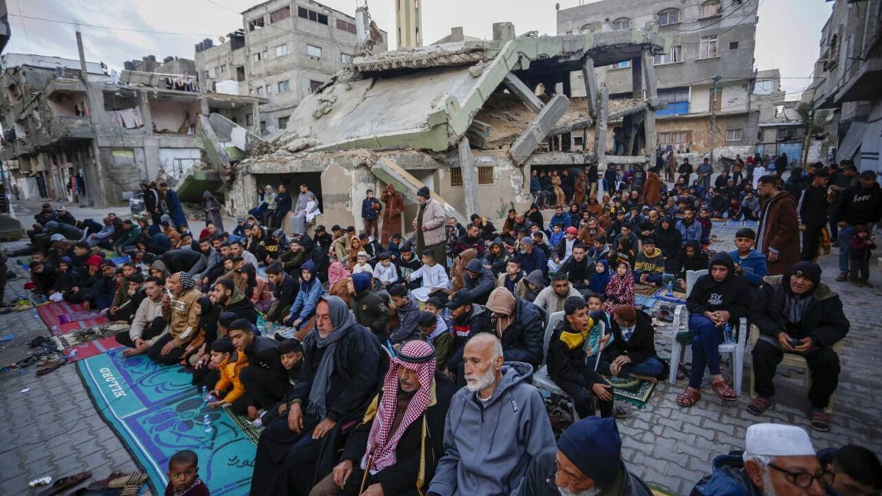 Gazze Şeridi'nin güneyindeki Refah kentindeki Filistinliler, Ramazan Bayramı namazını İsrail saldırılarında yıkılan İbn-i Teymiyye Camii enkazında ve çevresinde kıldı.