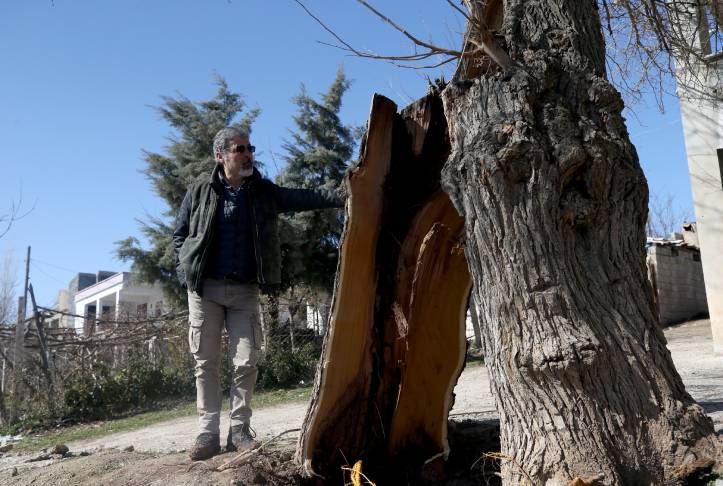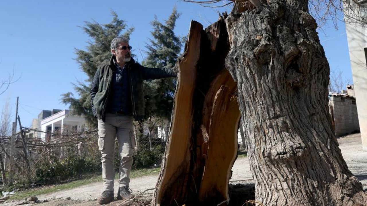 Kahramanmaraş merkezli ilk depremin merkez üssü Pazarcık ilçesinde fayın yüzey kırıklarını araştıran Dokuz Eylül Üniversitesi (DEÜ) Deprem Araştırma ve Uygulama Merkezi Müdürü Prof. Dr. Hasan Sözbilir, deprem sırasında ikiye ayrılan ağaç ve çevresinde inceleme yaptı.