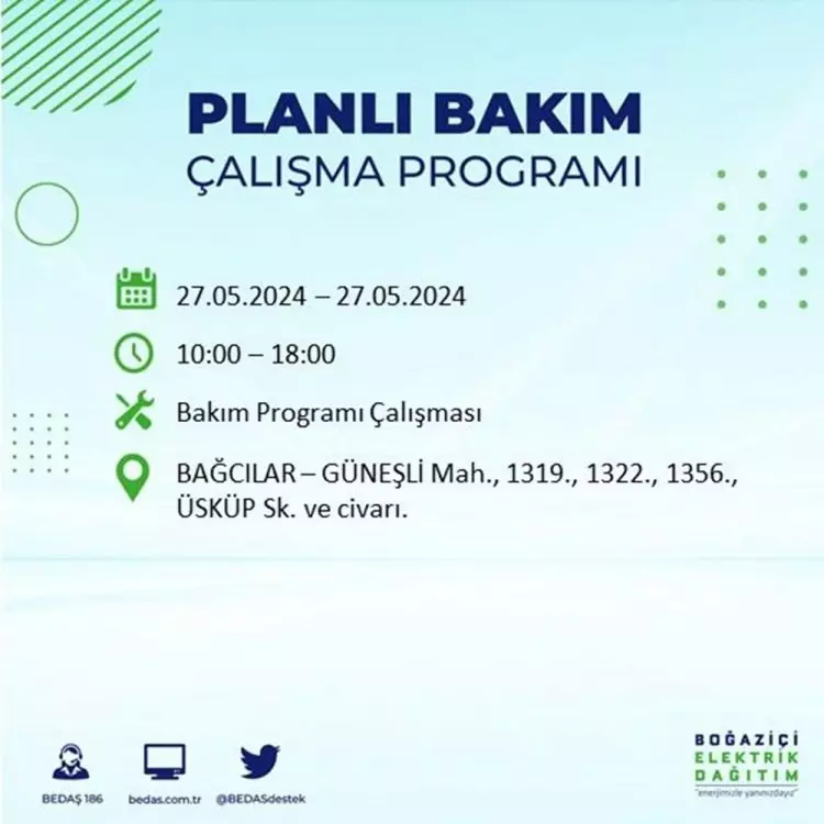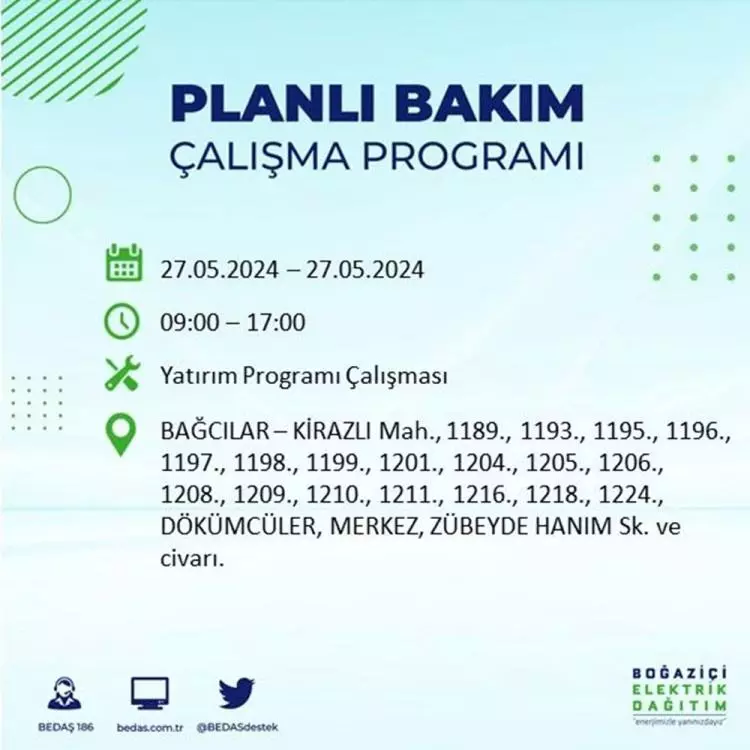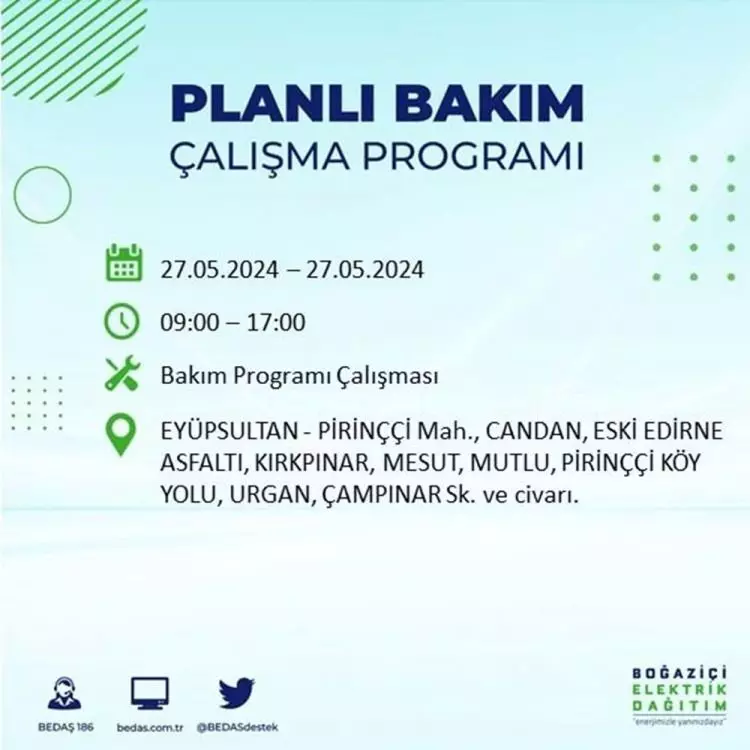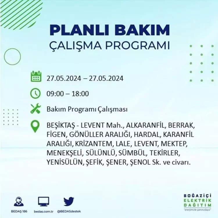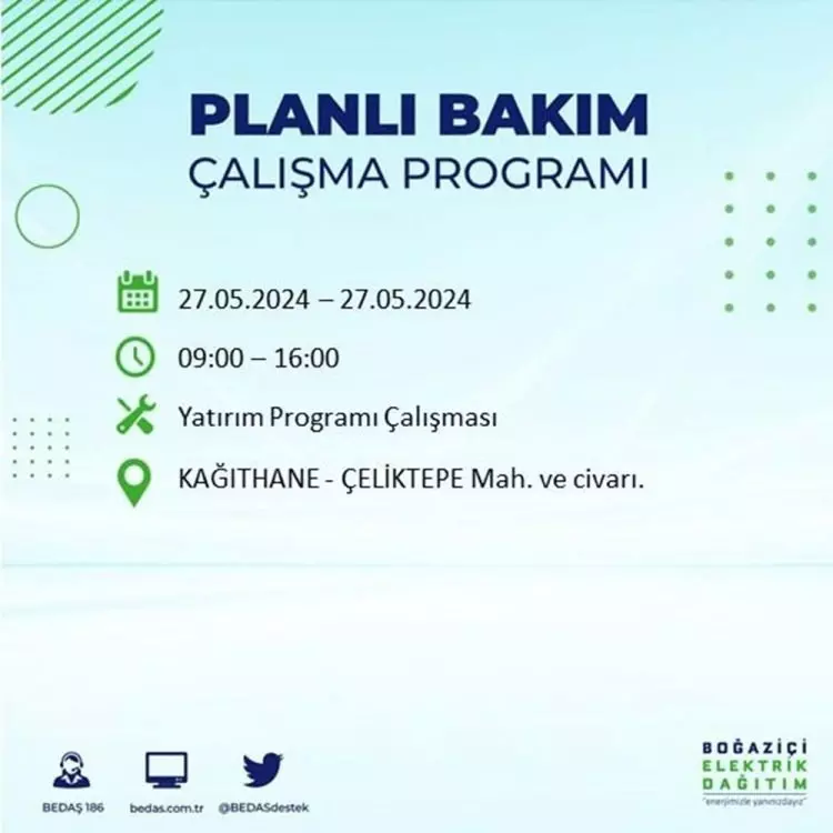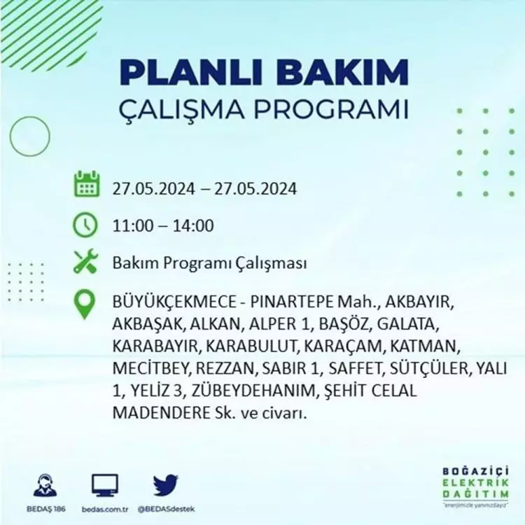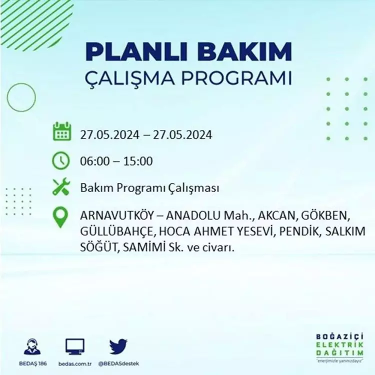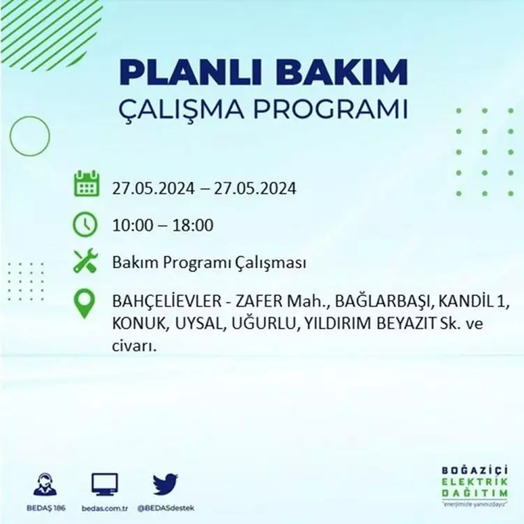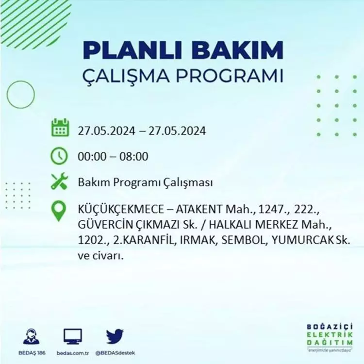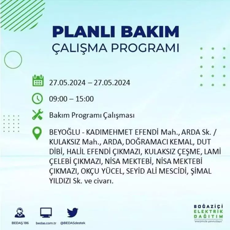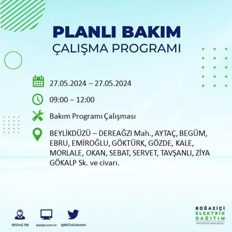 BEDAŞ, 27 Mayıs elektrik kesintisi programını paylaştı. Planlı yatırım ve bakım çalışmaları kapsamında İstanbul'un 21 ilçesinde elektirik kesintisi yaşanacak.