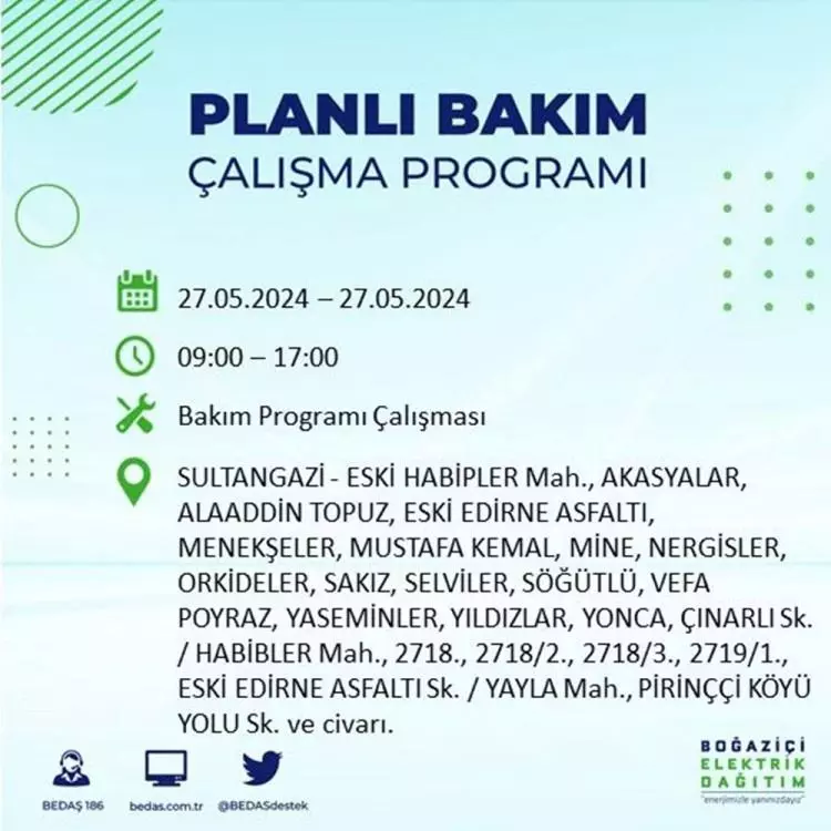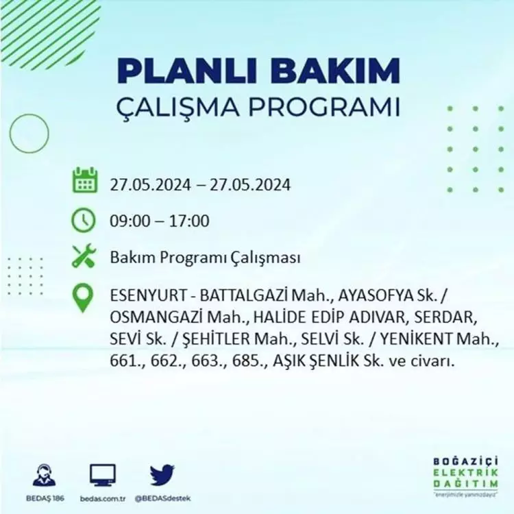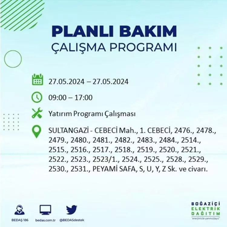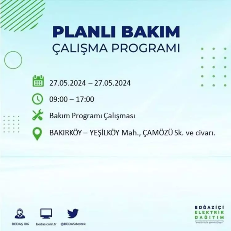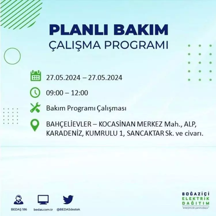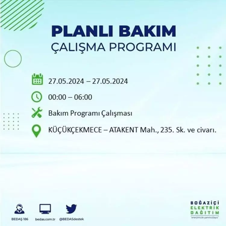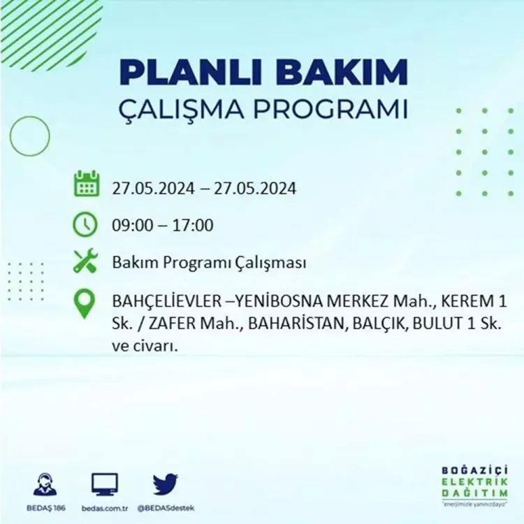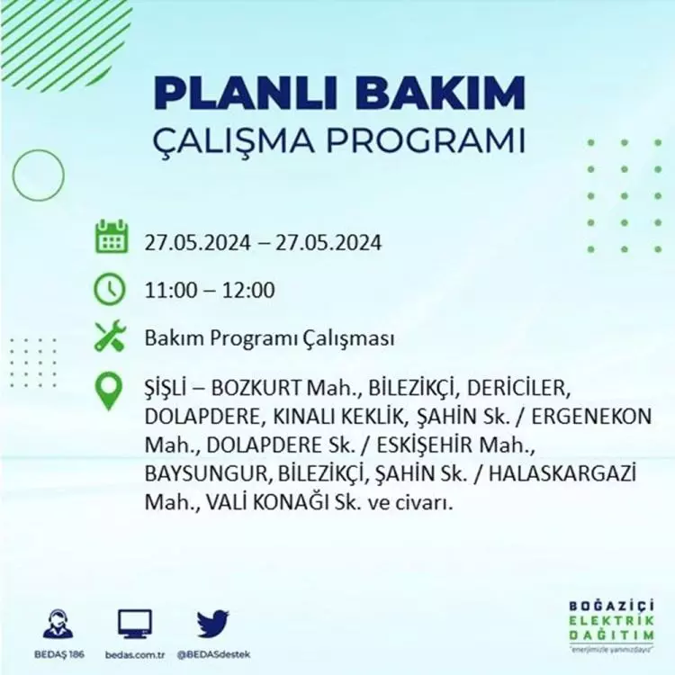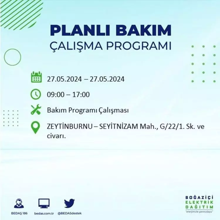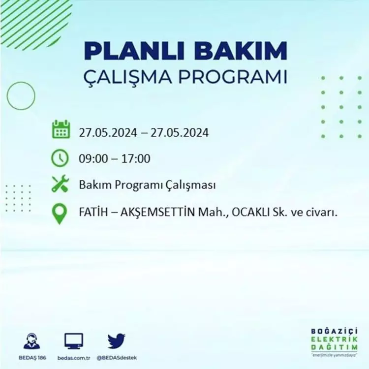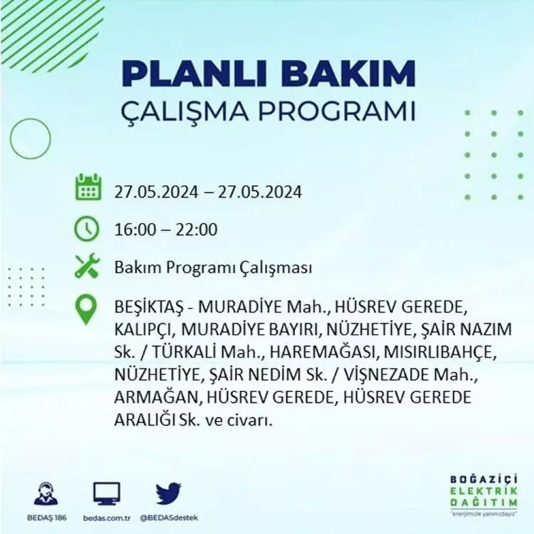 BEDAŞ, 27 Mayıs elektrik kesintisi programını paylaştı. Planlı yatırım ve bakım çalışmaları kapsamında İstanbul'un 21 ilçesinde elektirik kesintisi yaşanacak.