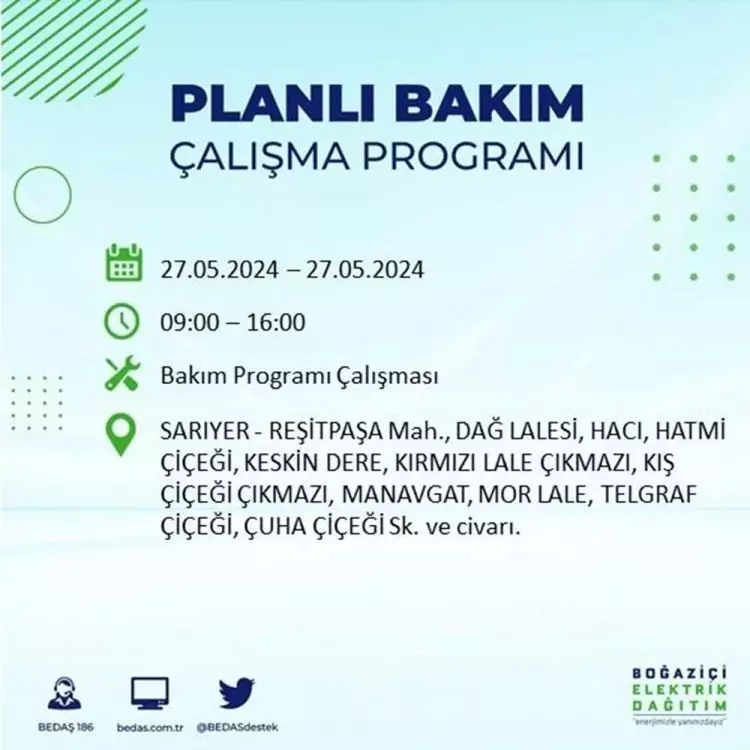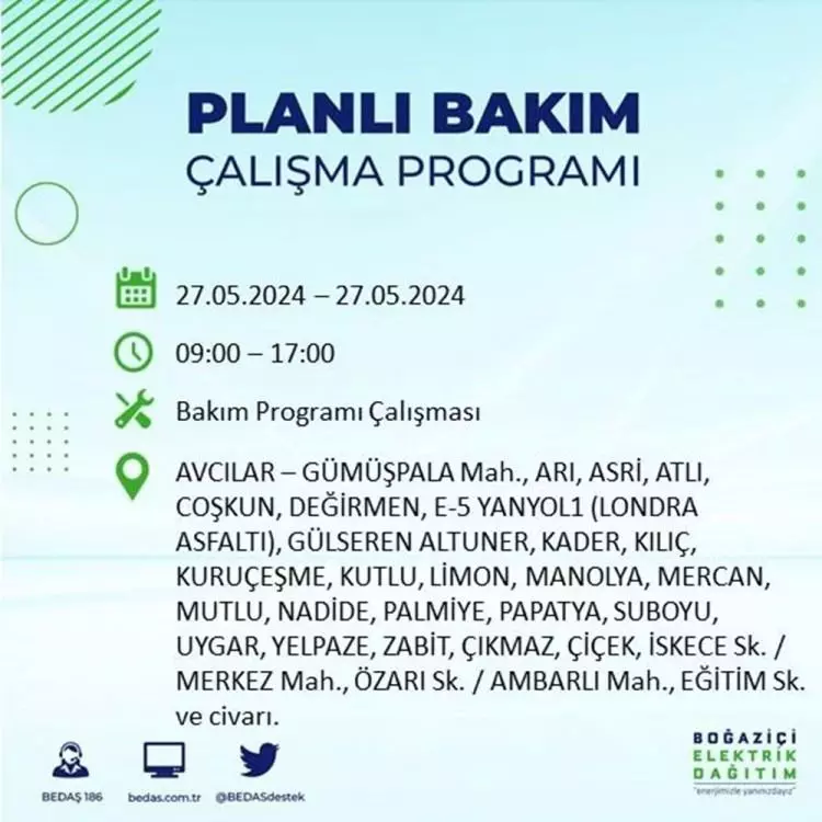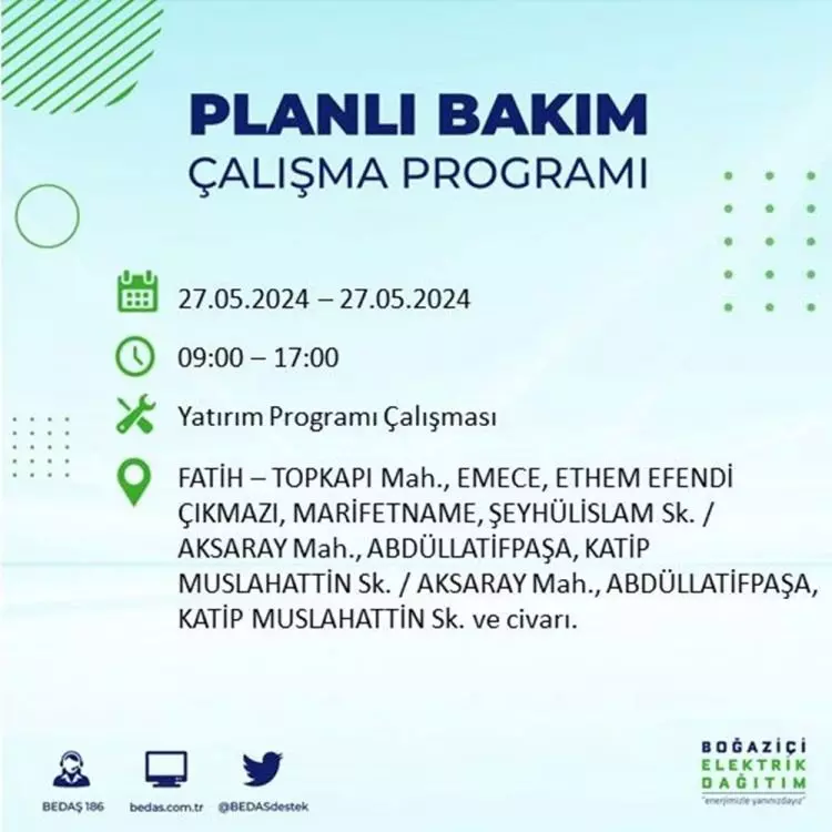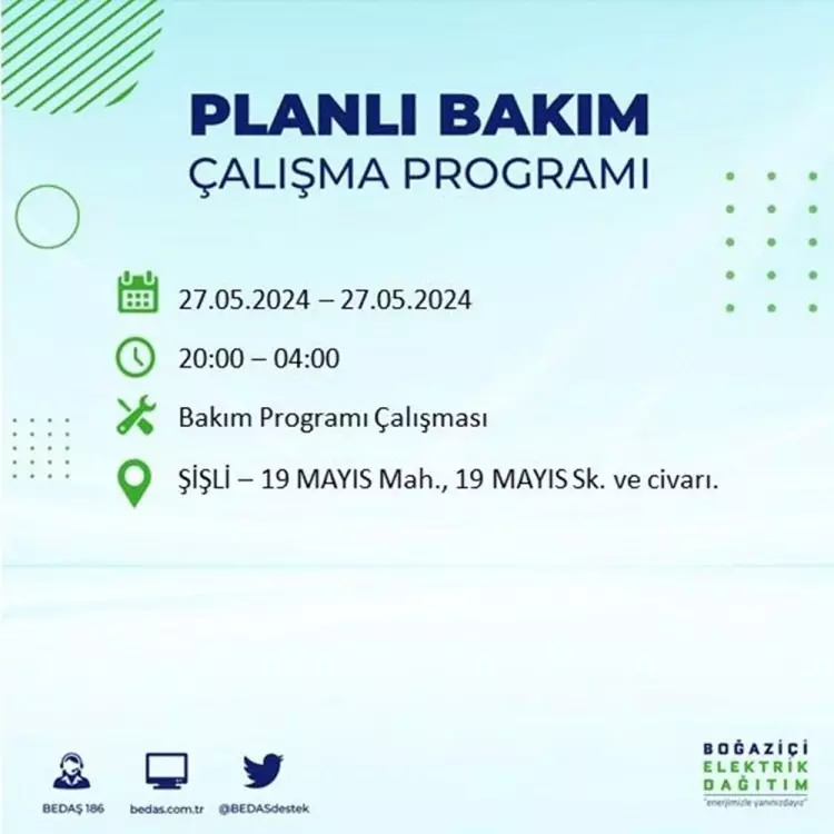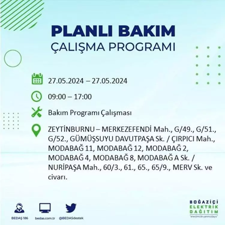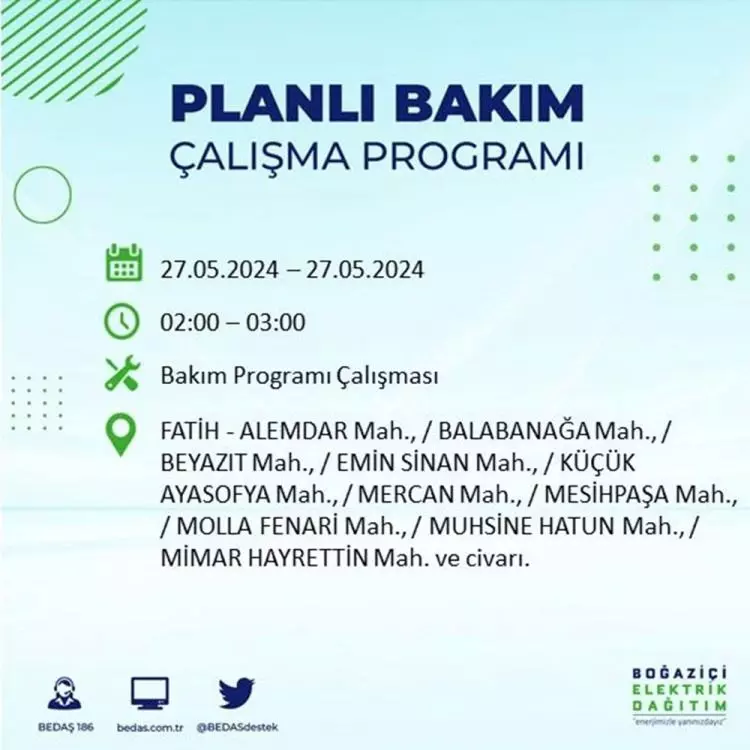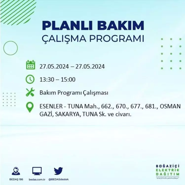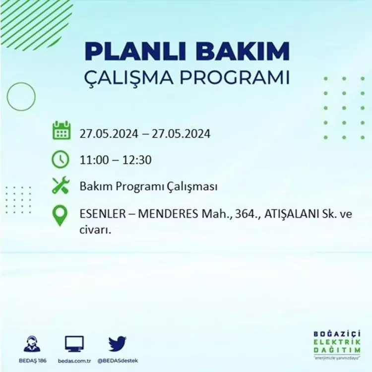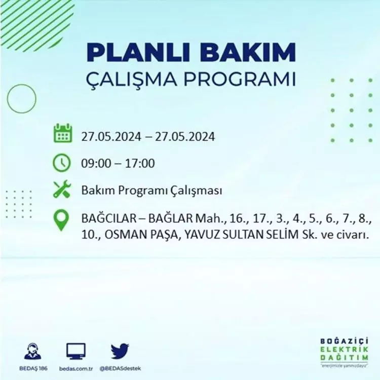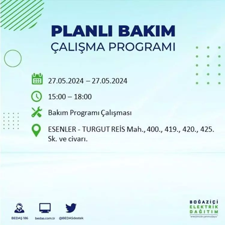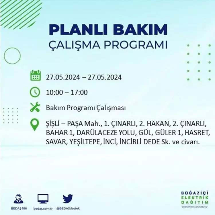 BEDAŞ, 27 Mayıs elektrik kesintisi programını paylaştı. Planlı yatırım ve bakım çalışmaları kapsamında İstanbul'un 21 ilçesinde elektirik kesintisi yaşanacak.