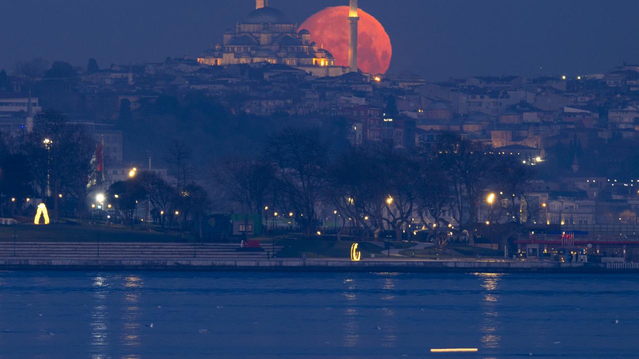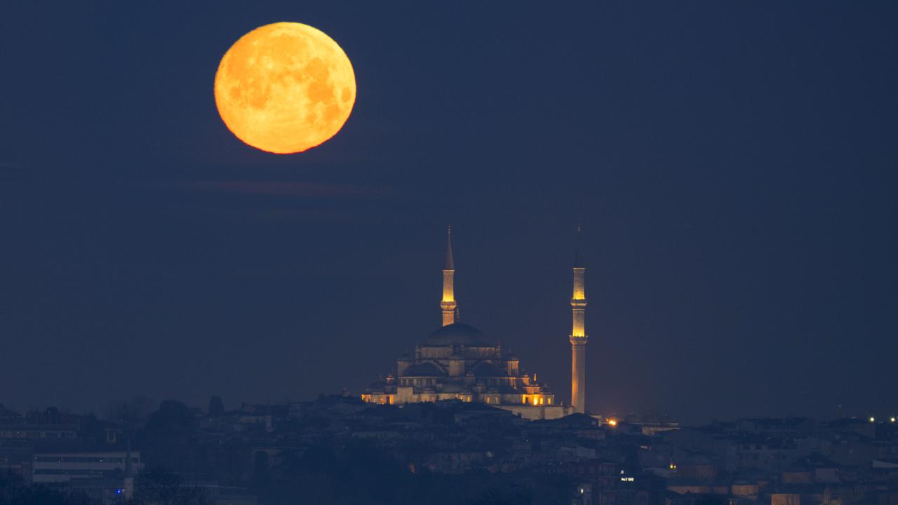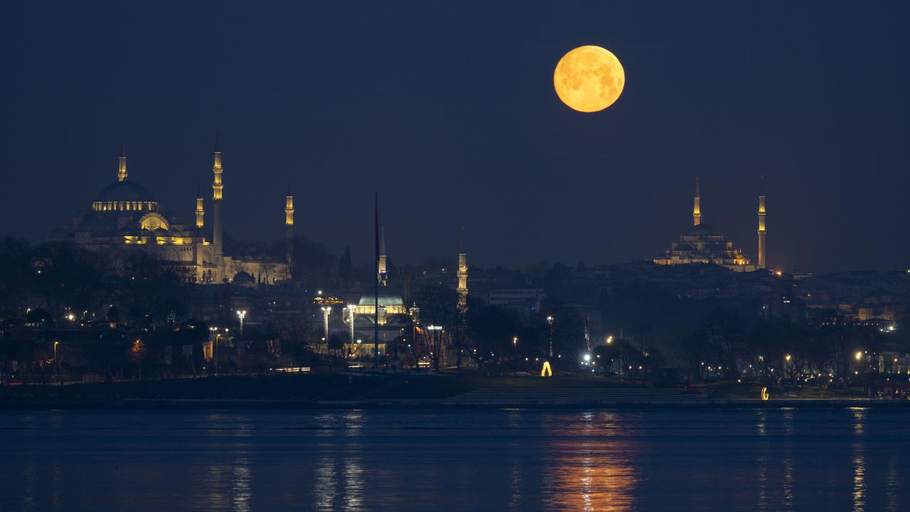İstanbul'da dolunay, Fatih Camisi ile birlikte kartpostallık görüntüler oluşturdu.