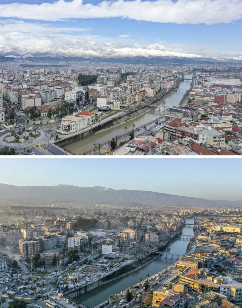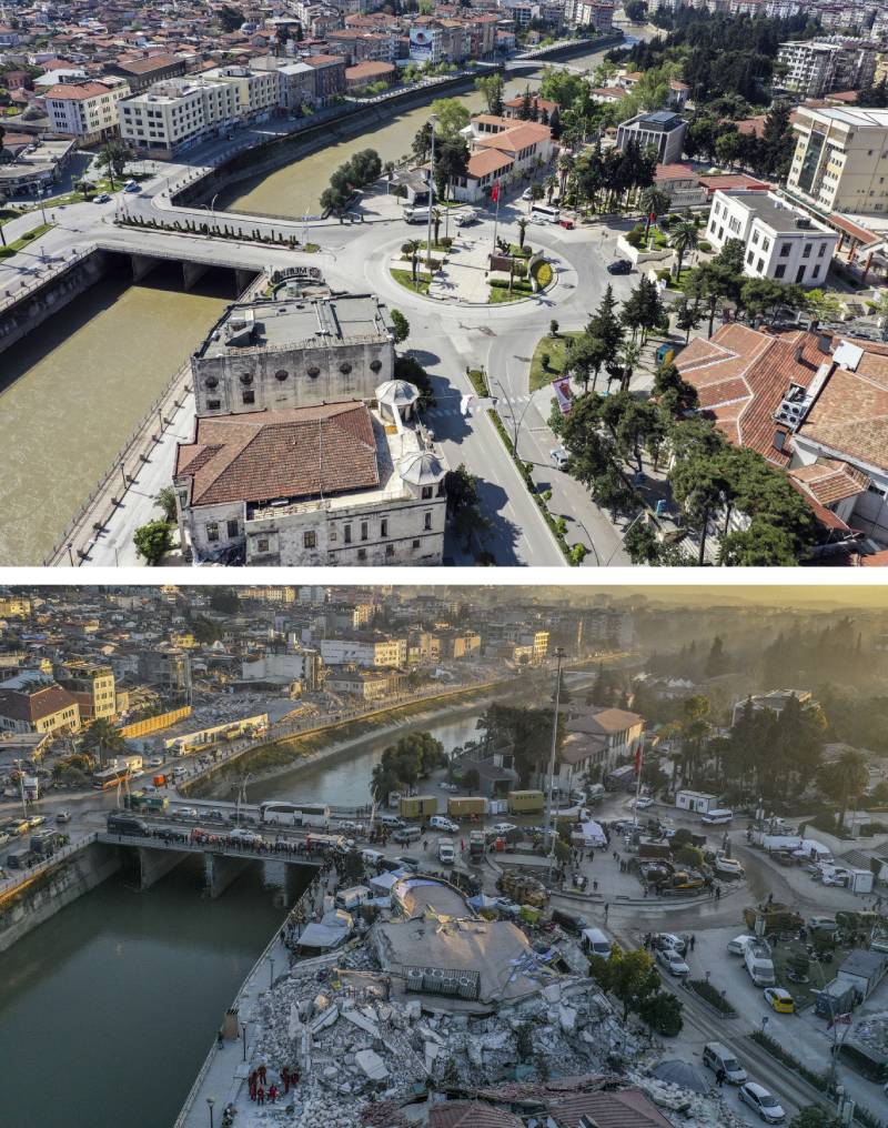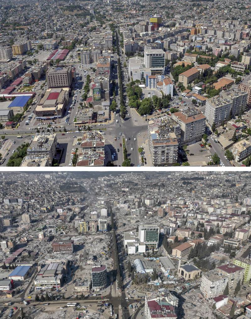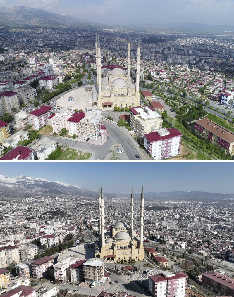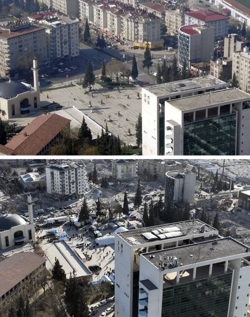 Asrın felaketi olarak nitelenen depremlerden etkilenen Kahramanmaraş kent merkezinin önceki yıllarda çekilen fotoğrafları ile deprem sonrasında aynı açılardan dronla çekilen fotoğraflar, yıkımın boyutunu gösteriyor.