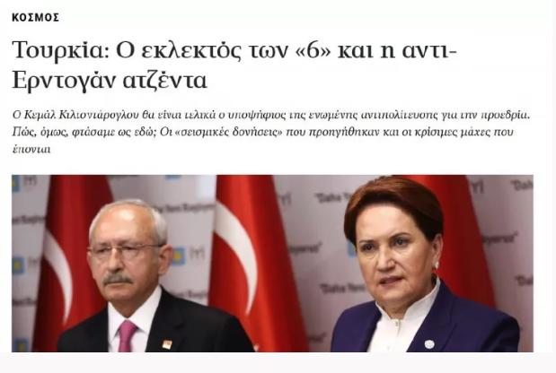 YUNAN MEDYASINDAN ÇARPICI BENZETME Yunanistan’ın çok okunan gazetelerinden Kathimerini, "Türkiye’de altılı masanın adayı ve Erdoğan’a karşı programı belli oldu" başlığını kullandı. Gazete, 6 Şubat’ta yaşanan deprem sonrasında Cumhurbaşkanı Erdoğan’ın hamlelerinin tepki çektiğini yazdı. Yunan medyası Kılıçdaroğlu’nun adaylığı ile ilgili dikkat çekici yorumda bulundu. Gazete, "6 Şubat’ta meydana gelen 7.8 büyüklüğündeki deprem, 14 Mayıs’ta yapılacak seçimler öncesinde zemini sarstı" yorumunu yaptı. Gazetede, "Altılı muhalefet bloğu cuma günkü dağılmadan sonra bir araya geldi ve Kılıçdaroğlu’nun adaylığı duyurdu" denilirken, son dakikada yapılan görüşmeler ile birlikte muhalefet bloğunun 5’ten sonra 6’ya ulaştığına dikkat çekildi.