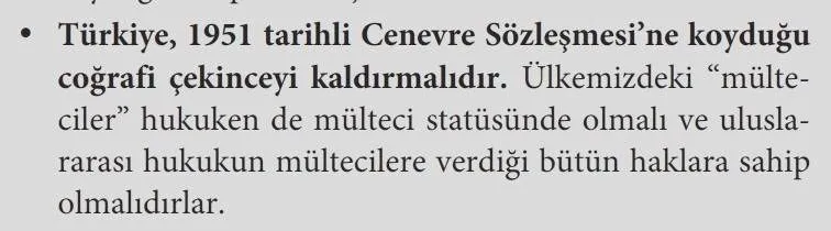 Türkiye, 1951 tarihli Cenevre Sözleşmesi’ne koyduğu coğrafi çekinceyi kaldırmalıdır. Ülkemizdeki “mülteciler” hukuken de mülteci statüsünde olmalı ve uluslararası hukukun mültecilere verdiği bütün haklara sahip olmalıdırlar.