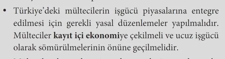 Türkiye’deki mültecilerin işgücü piyasalarına entegre edilmesi için gerekli yasal düzenlemeler yapılmalıdır. Mülteciler kayıt içi ekonomiye çekilmeli ve ucuz işgücü olarak sömürülmelerinin önüne geçilmelidir.