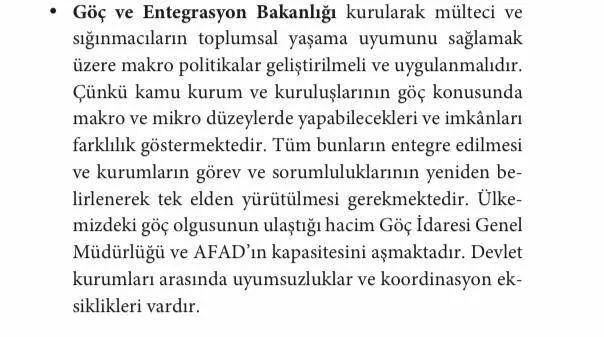 Göç ve Entegrasyon Bakanlığı kurularak mülteci ve sığınmacıların toplumsal yaşama uyumunu sağlamak üzere makro politikalar geliştirilmeli ve uygulanmalıdır. Çünkü kamu kurum ve kuruluşlarının göç konusunda makro ve mikro düzeylerde yapabilecekleri ve imkânları farklılık göstermektedir. Ülkemizdeki göç olgusunun ulaştığı hacim Göç İdaresi Genel Müdürlüğü ve AFAD’ın kapasitesini aşmaktadır. Güvenlik kuvvetleri yabancı düşmanlığı konusunda eğitilmeli, terörizm ve sığınmacı göçünün birbirinden farklı olgular oldukları konusunda bilinçlendirilmeli.