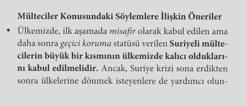 Ülkemizde, ilk aşamada misafir olarak kabul edilen ama daha sonra geçici koruma statüsü verilen Suriyeli mültecilerin büyük bir kısmının ülkemizde kalıcı oldukları kabul edilmelidir. Ancak, Suriye krizi sona erdikten sonra ülkelerine dönmek isteyenlere de yardımcı olunmalıdır.