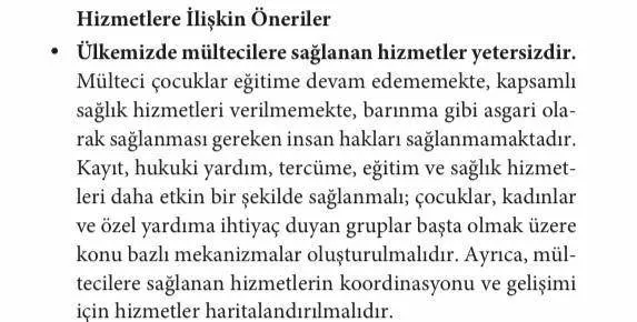 Mülteci çocuklar eğitime devam edememekte, kapsamlı sağlık hizmetleri verilmemekte, barınma gibi asgari olarak sağlanması gereken insan hakları sağlanmamaktadır. Kayıt, hukuki yardım, tercüme, eğitim ve sağlık hizmetleri daha etkin bir şekilde sağlanmalı; çocuklar, kadınlar ve özel yardıma ihtiyaç duyan gruplar başta olmak üzere konu bazlı mekanizmalar oluşturulmalıdır. Ayrıca, mültecilere sağlanan hizmetlerin koordinasyonu ve gelişimi için hizmetler haritalandırılmalıdır.