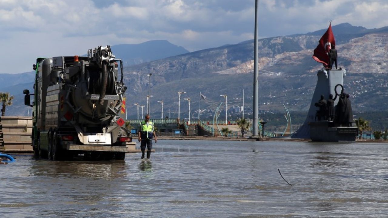 Kahramanmaraş merkezli depremlerden etkilenen İskenderun'da, dün su altında kalan kıyı şeridindeki caddelerde belediye ekiplerince başlatılan su tahliyesi çalışmaları sürdü.