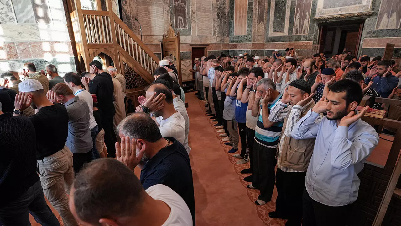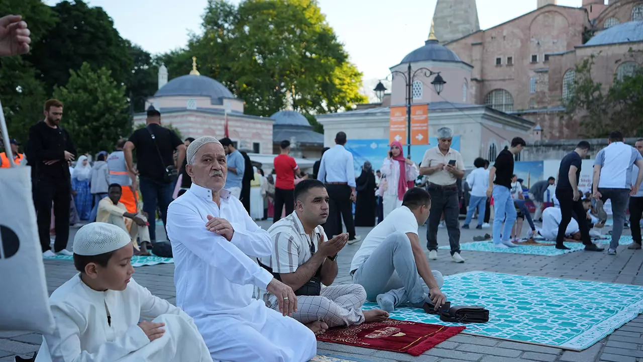Ayasofya da erken saatlerde namazı kılmak isteyen vatandaşlar tarafından dolduruldu.Camînin içerisi namaz vaktinden önce dolarken, yüzlerce vatandaş da namazını dışarıda kıldı.