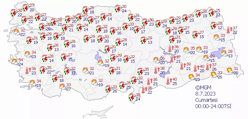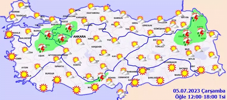Meteoroloji Genel Müdürlüğü tarafından yayımlanan hava durumu raporuna göre; ülkemizin kuzey ve iç kesimleri yer yer parçalı bulutlu, öğle saatlerinden sonra Doğu Akdeniz'in Toroslar mevkii ile Erzurum, Kars, Ardahan, Bolu, Sakarya'nın güneyi, Bursa'nın doğusu, Eskişehir, Bilecik ve Kütahya çevreleri yerel sağanak ve gök gürültülü sağanak yağışlı, diğer yerlerin açık geçeceği tahmin ediliyor.