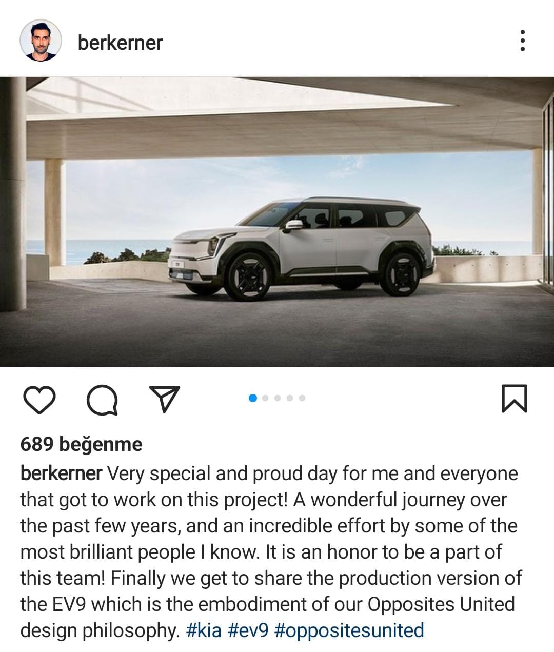 Türk tasarımcı Berk Erner instagram sayfasında " Opposites United tasarım felsefemizin vücüt bulmuş hali olan EV9'un üretim sürümünü sonunda paylaşabiliyoruz" diye elinden çıkan yeni elektrikli SUV'u EV9'u tanıttı.
