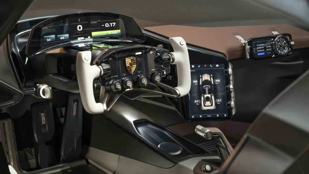 Porsche Mission X konsepti uçak manivelası şeklindeki direksiyonu, dijital gösterge paneli ve vites kolu tasarımıyla yarışçı ruhunu sergiliyor.