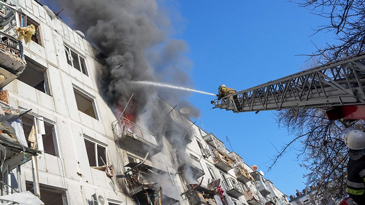 Rus saldırıları sırasında Kharkiv kentindeki bir apartman kompleksi zarar gördü. En az bir kişinin yaralandığı, ayrıca olay yerinde bir kişinin yerde yattığı görüldü.