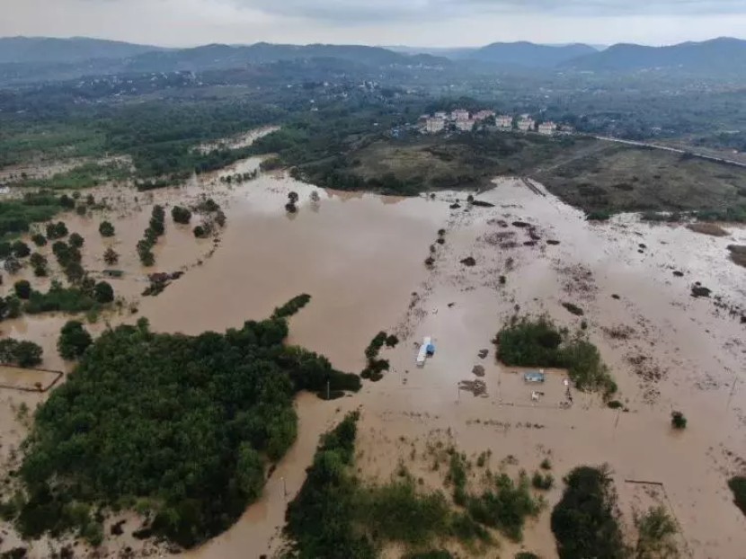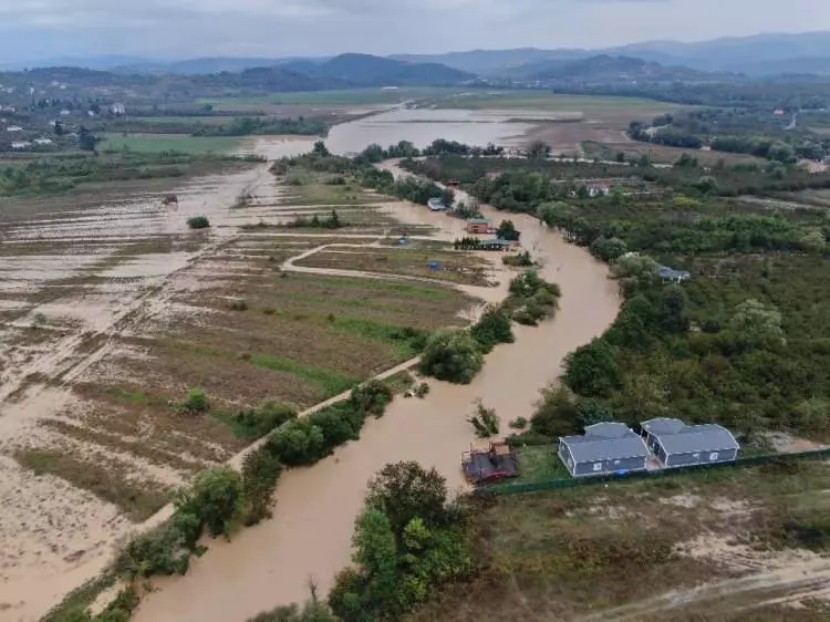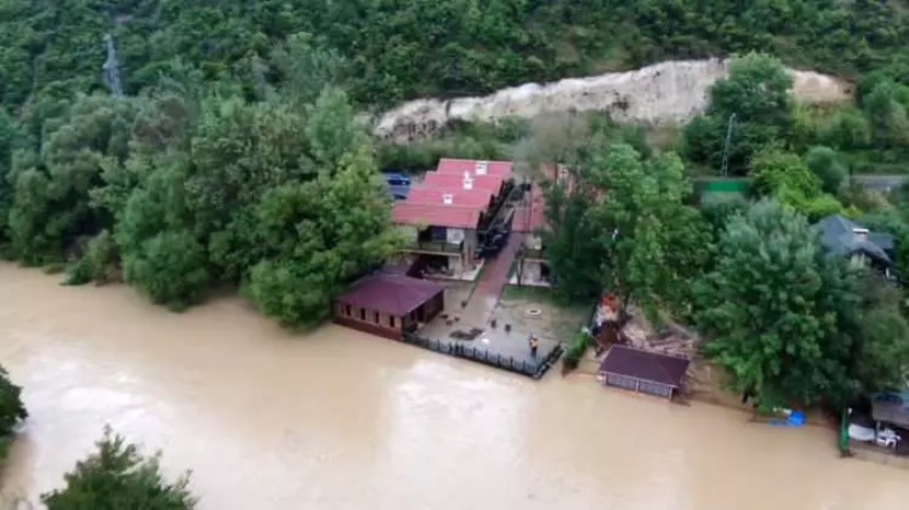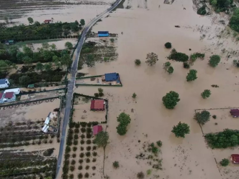 Şile’de etkili olan şiddetli yağış nedeniyle Yeşilçay Deresi taştı. Su altında kalan tarım arazileri, evler ve bungalovlar dron ile havadan görüntülendi.