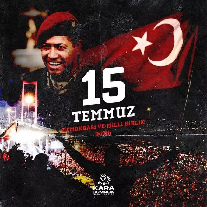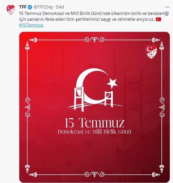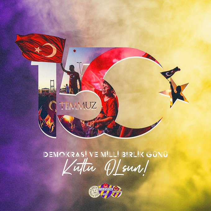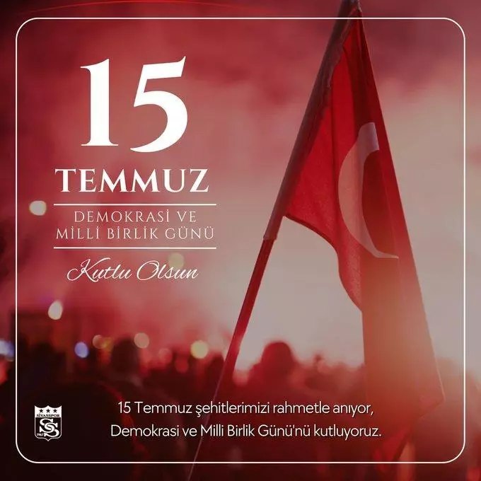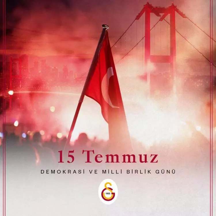 Galatasaray: Ülkemizin bütünlüğünü bölmeye yönelik hain darbe girişiminin 8. yılında demokrasi şehitlerimizi rahmetle anıyoruz. Türk milletinin kendi geleceğini belirleme hakkını gasp etmeye çalışanların, karanlık emellerine asla ulaşamamalarını yürekten diliyoruz. Cumhuriyetimizin çağdaşlık ufku daima açık, 15 Temmuz Demokrasi ve Milli Birlik Günü birlik beraberliğimizin güçlü temellerinden olsun.