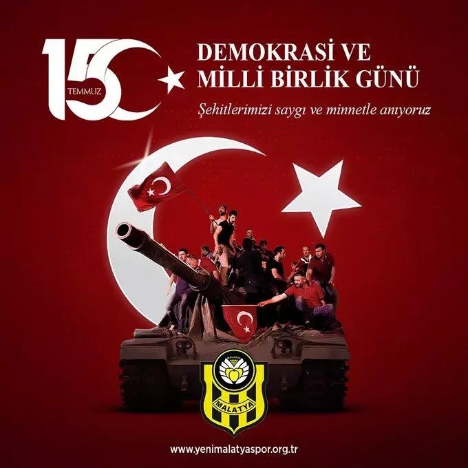 Yeni Malatyaspor: Ülkemizin kaderini değiştiren 15 Temmuz Demokrasi ve Milli Birlik Günü’nün 8. yıl dönümünde; vatan ve bayrak uğruna canlarını, gözlerini kırpmadan veren aziz şehitlerimizi, rahmet ve minnetle anıyoruz.