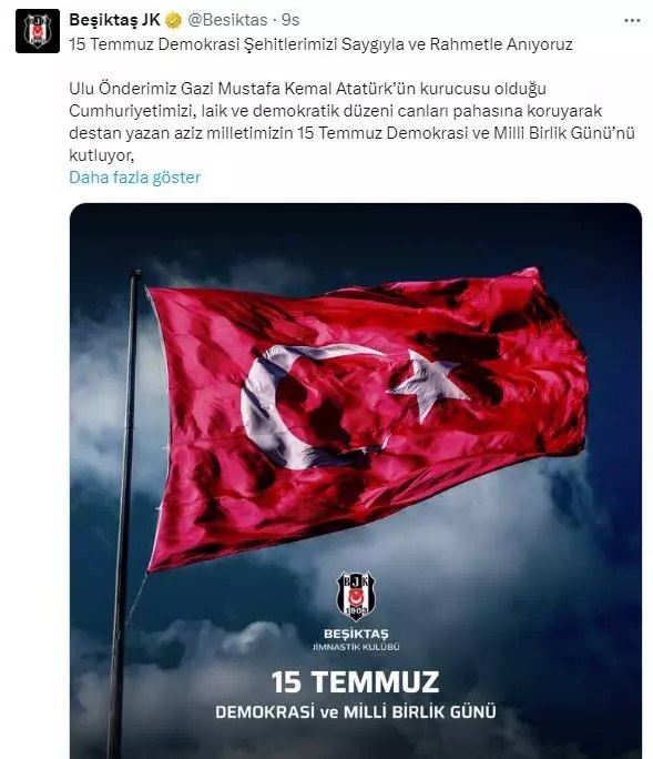 Beşiktaş: 15 Temmuz Demokrasi Şehitlerimizi Saygıyla ve Rahmetle Anıyoruz! Ulu Önderimiz Gazi Mustafa Kemal Atatürk’ün kurucusu olduğu Cumhuriyetimizi, laik ve demokratik düzeni canları pahasına koruyarak destan yazan aziz milletimizin 15 Temmuz Demokrasi ve Milli Birlik Günü’nü kutluyor, bu uğurda şehit düşen vatandaşlarımızı saygıyla ve rahmetle anıyor, gazilerimize şükranlarımızı sunuyoruz.