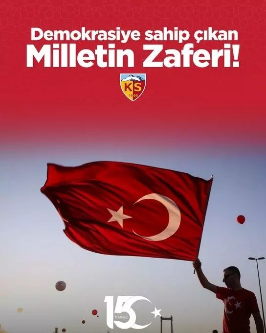 Kayserispor: 15 Temmuz hain darbe girişimine karşı dik duran milletimize şükranlarımızı sunuyor; vatanımızın birlik ve beraberliği için şehit olan vatandaşlarımıza Allah’tan rahmet diliyoruz.