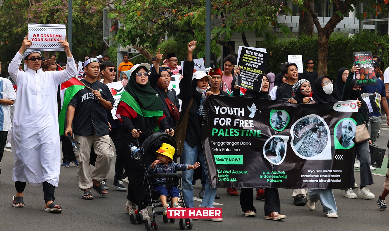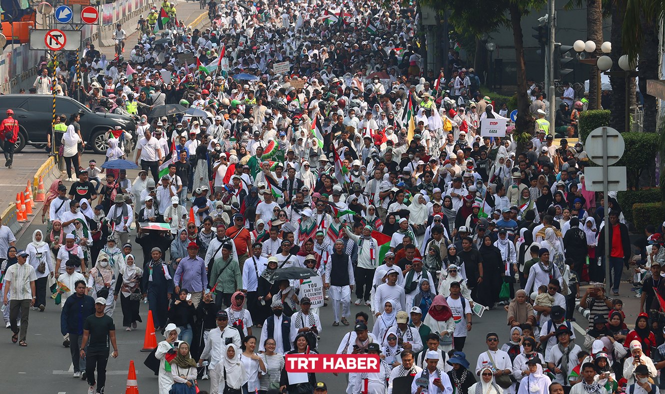 Endonezya'nın başkenti Cakarta'da binlerce kişi Filistin'e destek gösterisi için bir araya geldi.