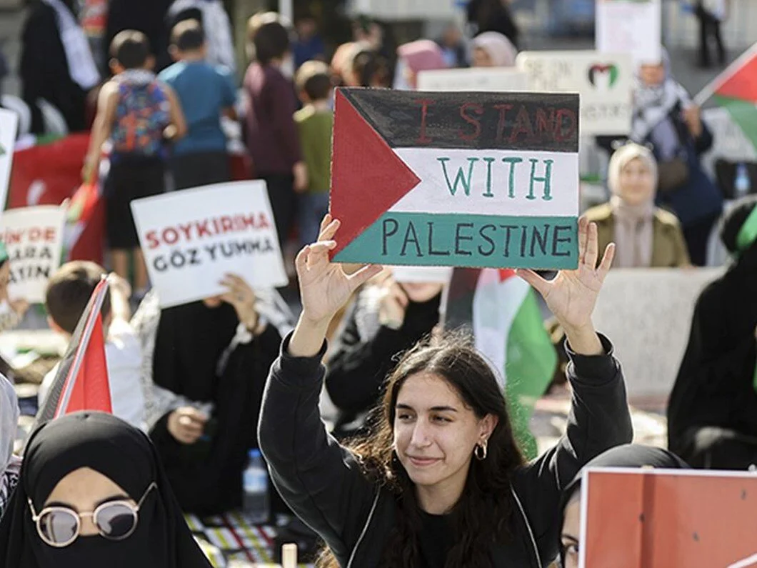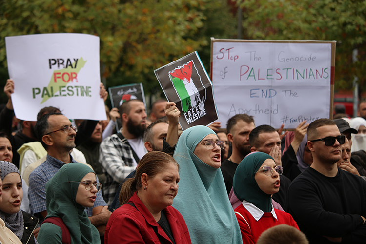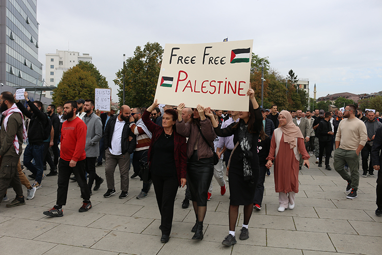Kosova'nın başkenti Priştine'nin ana meydanında toplanan yüzlerce kişi İsrail'e karşı, "Filistin'e özgürlük", "Filistin ve insan hakları için ayağa kalk", "Soykırımı durdurun" sloganları attı.
