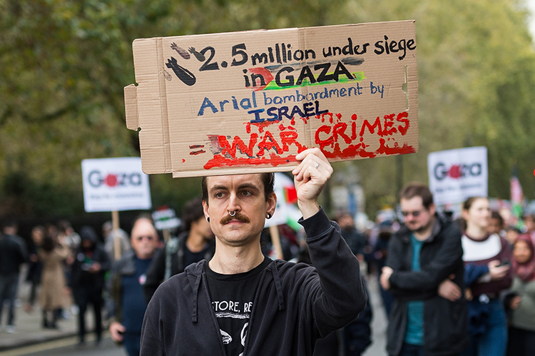 İngiltere'nin başkenti Londra'da, Filistin'le dayanışma gösterisi için toplanan on binlerce kişi, polisin yoğun güvenlik önlemleri altında Başbakanlığa yürüdü.
