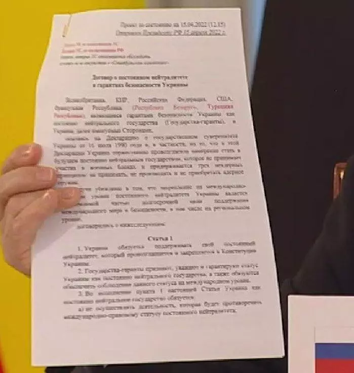 Belgeyi elinde tutarak, Afrikalı liderlere gösteren Putin, bu metnin, "Ukrayna'nın güvenliğinin garantileri ve kalıcı tarafsızlık anlaşması" olarak adlandırıldığını ifade etti. Metinde 18 maddenin bulunduğunu bildiren Putin, askeri birliklerden teçhizata kadar her şeyin detaylı olarak bu metinde yer aldığını anlattı.Rus ordusu Kiev'den çekildikten sonra Kiev yönetiminin bu anlaşmayı "çöpe attığını" vurgulayan Putin, "Gelecekte başka herhangi bir anlaşmadan vazgeçmeyeceklerinin garantisi nerede? Ancak bu koşullar altında bile müzakere etmeyi asla reddetmedik. Biz değil, Ukrayna yönetimi kendisi müzakere yapmayacağını ilan etti. Hatta, Ukrayna Devlet Başkanı (Zelenski), müzakere yapmayı yasaklayan karar imzaladı. Bizden ne istiyorlar?" dedi.