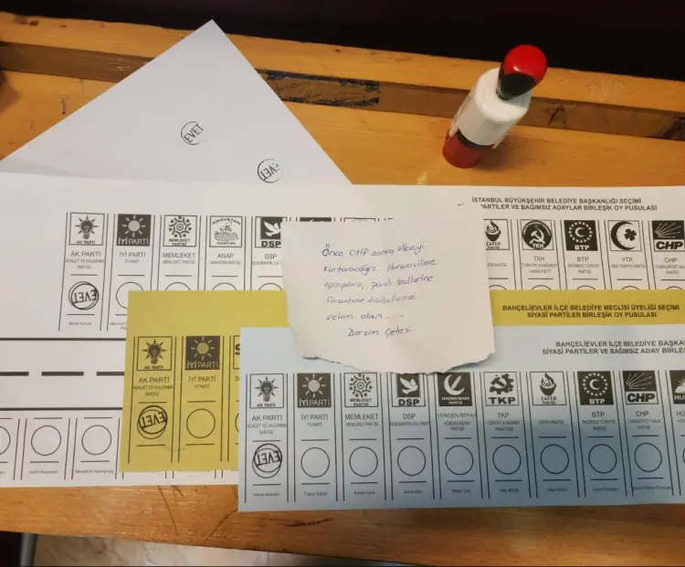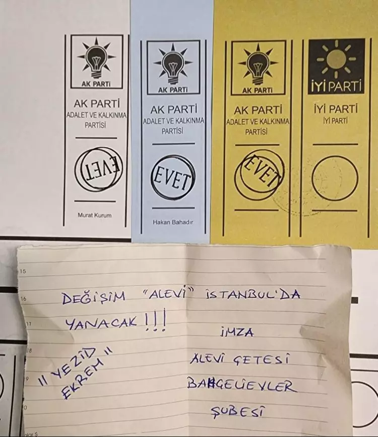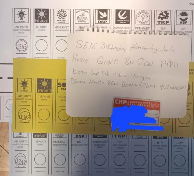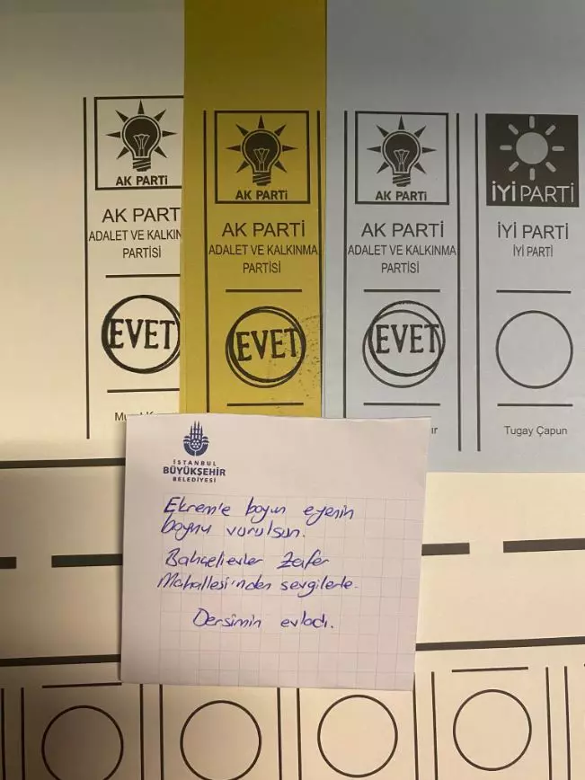 TKP'li İstanbul seçmeni bir vatandaş İBB Başkanlığı için oyunu Cumhur İttifakı adayı Murat Kurum'dan yana kullanarak; "Yürü be Hızır Paşa. Senin de çarkın kırılır. Güvendiğin padişahın, o da bir gün devrilir." notunu paylaştı.