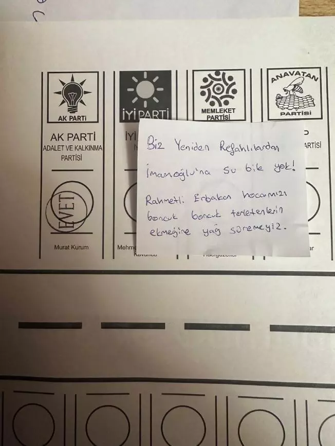 Yeniden Refah Partili bir vatandaş İstanbul Büyükşehir Belediye Başkanlığı seçimlerinde tercihini Cumhur İttifakı'nın adayı Murat Kurum'dan yana kullanarak şu notu yazdı;