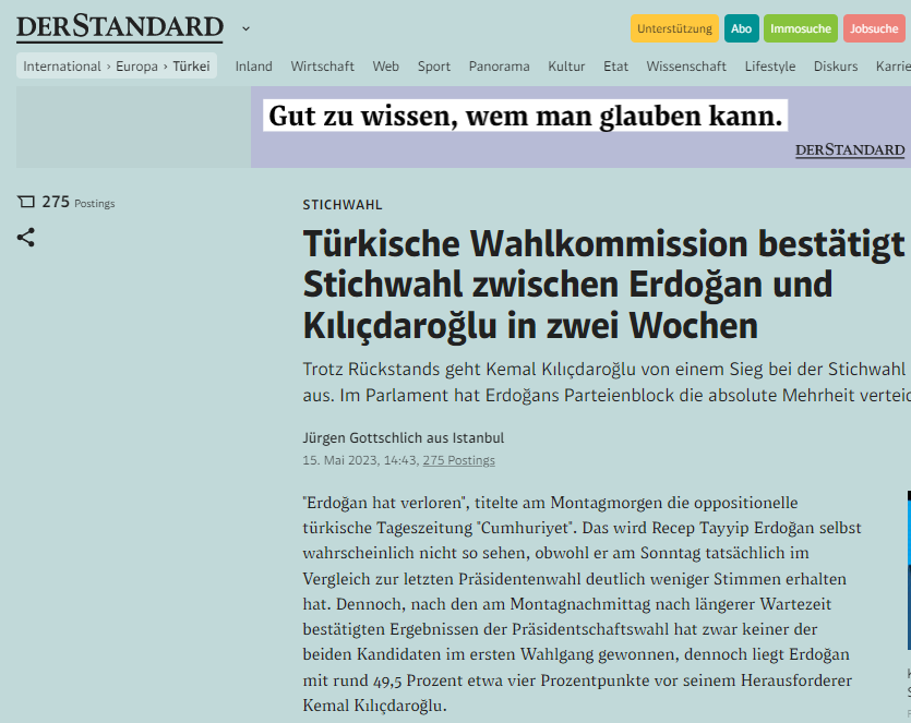Avusturya'nın kamu yayıncı kuruluşu ORF, Türkiye'deki seçimlere ilişkin haberini "Türkiye, ikinci tur seçimlere gidiyor" başlığıyla okuyucularıyla paylaştı. Haberde, yaklaşık 20 yıldır iktidarda olan Cumhurbaşkanı Erdoğan'ın ilk defa ikinci tura kaldığı ancak mecliste Cumhur İttifakı'nın çoğunluğu elde etmeyi başardığı ifade edildi.Ülkenin önde gelen gazetelerinden Der Standard, seçimleri "Erdoğan ve Kılıçdaroğlu arasındaki cumhurbaşkanlığı yarışı ikinci tura gidileceğine işaret ediyor" başlığıyla okuyucularına duyurdu.