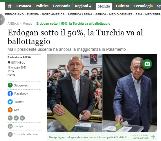 İtalyan ANSA ajansı da "Türkiye, ikinci tura gidiyor. Erdoğan yüzde 50'nin altında" başlığıyla Türkiye'deki seçimleri manşetten duyurdu. ANSA'nın haberinde Cumhurbaşkanı Erdoğan'ın resmi sonuçlar olmasa da zirvede yer aldığını ilan ettiği, ikinci turda çıkan sonuca saygı duyacağını söylediği aktarıldı.La Stampa gazetesi ikinci tur için, "Recep Tayyip Erdoğan, rakibi Kılıçdaroğlu'na göre telafisi mümkün görünmeyen bir avantajla ikinci tura gidiyor. Yüzde 50'ye çok yakın, diğeri yüzde 44'ün biraz üzerinde." değerlendirmesini yaptı.La Repubblica gazetesi "Türkiye, ikinci tura doğru gidiyor" başlığıyla verdiği haberinde "Bazı analizlere göre, ikinci turda Erdoğan zafer için büyük şansa sahip olabilir ama burada bu seçimin sürprizi olan Sinan Oğan'ın oyları belirleyici olacak." ifadeleri yer aldı.
