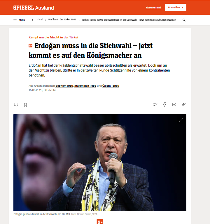 Almanya'da Spiegel dergisi seçimler ilgili haberinde Cumhurbaşkanı Erdoğan'ın cumhurbaşkanı seçiminde beklenenden daha iyi bir performans sergilediğini vurguladı.Haberde, Erdoğan'ın birçok anketin öngördüğünden daha iyi oy oranına ulaştığı ve ikinci tura açık bir şekilde favori olarak girdiği belirtildi. Öte yandan, ilk turda Ata İttifakı cumhurbaşkanı adayı olan Oğan'ın desteğinin ikinci turda "sonucu belirleyici bir güç" olacağı öne sürüldü.