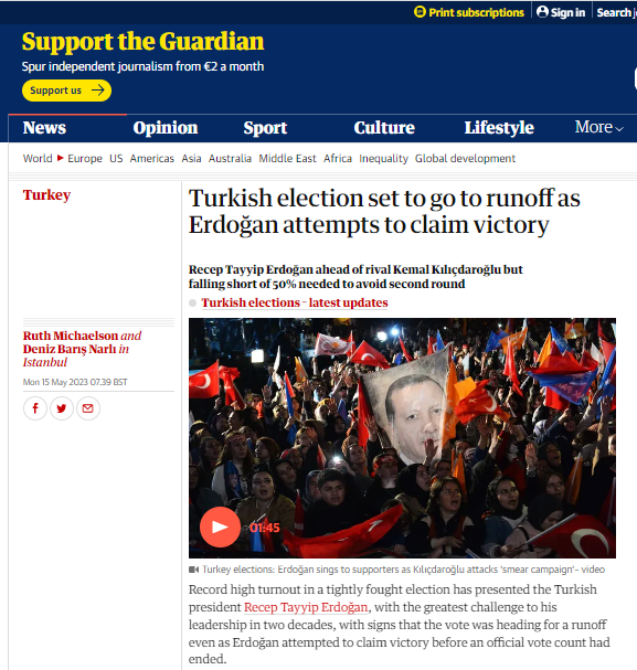 İngiliz The Guardian gazetesi birinci sayfasında seçimin yüksek katılımla yapıldığına dikkati çekerek, "Yüksek katılımla yapılan Türkiye seçimleri ikinci tura gidiyor." ifadesini kullandı. Gazete, 4. ve 5. sayfasını da tamamen Türkiye seçimlerine ayırdı.