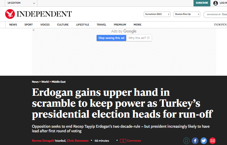 The Independent gazetesinde de "Türkiye seçimleri başa baş mücadelenin ardından ikinci tura gidiyor" başlığıyla yazılan haberde gece boyunca yapılan açıklamalara yer verildi, Ata İttifakı'nın cumhurbaşkanı adayı Sinan Oğan'ın diğer adayların kazanmasını önleyen faktör olduğu öne sürüldü.