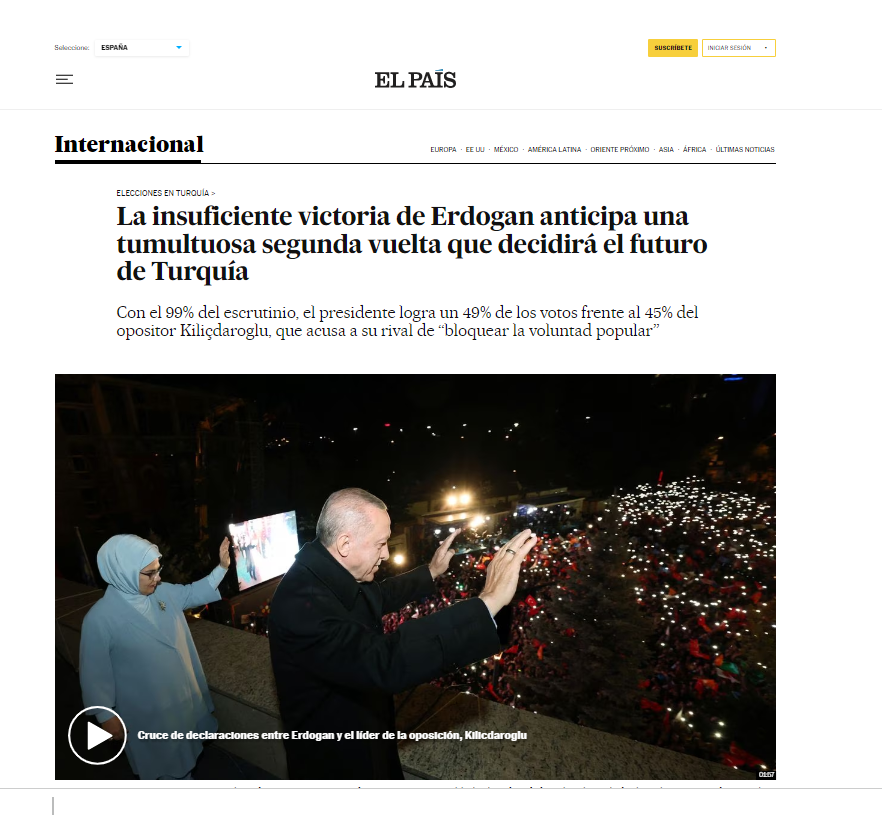 İspanya'da El Pais, "Erdoğan'ın ölçülü zaferi Türkiye'yi ikinci tura yönlendiriyor" başlığıyla verdiği haberinde, "Muhalefet adayı Kılıçdaroğlu, 4 puan geride kalıyor ve iki hafta sonra belirleyici zafere ulaşmanın yolunu arayacak." ifadeleri kullanıldı.El Mundo ve La Vanguardia seçimlerin ikinci tura kalmasını ön plana çıkarırken; La Razon, "Anketlerin söylediği gibi Türkiye'de cumhurbaşkanı seçimleri sonuna kadar başa baş geçti. Erdoğan'ın partisi mecliste kazandı. Seçimlere katılım rekor düzeyde oldu." ifadelerini öne çıkardı.