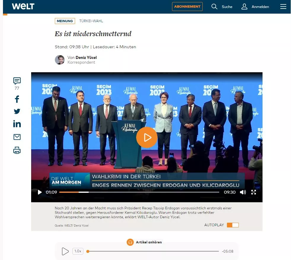 Alman gazetesi Die Welt'in yazarı Deniz Yücel'in seçim sonrası kaleme aldığı yazıda "O kadar kahredici ki, Seçimin ikinci tura gitmesi Erdoğan için beklenmedik büyüklükte bir başarı. Görünüşe göre Türklerin büyük bir kısmı, korkunç hükümet bilançosuna rağmen ona kurtarıcı gözüyle bakıyor'. dedi. Yücel, Başkan Erdoğan'ın ikinci tura favori olarak girdiğini de analizin sonunda verdi.