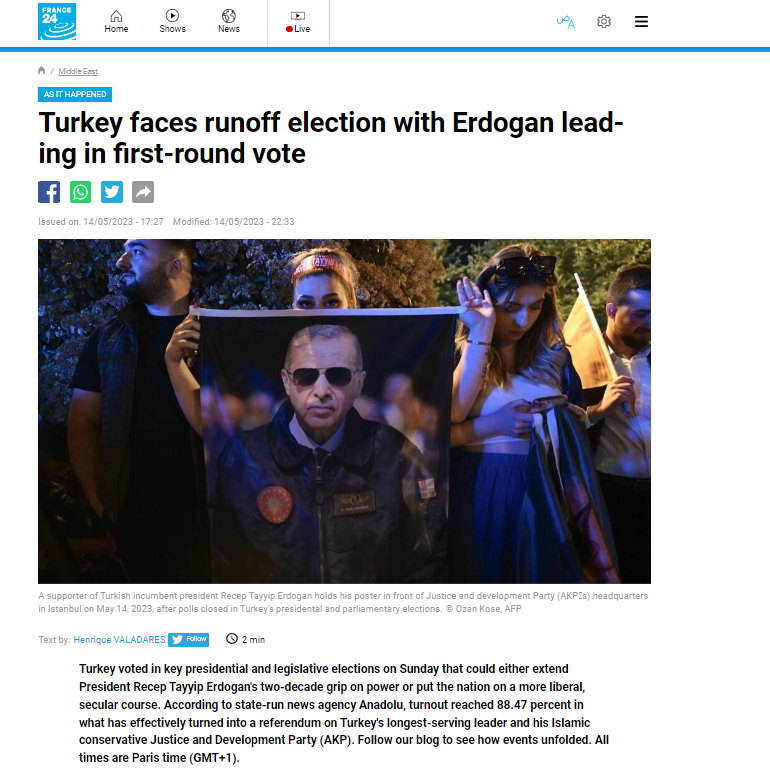 İkinci turda Erdoğan kazanır başlığı ile seçim sonrası manşet atan Fransız gazetesi France24 "Sinan Oğan seçmeni Erdoğan'ı tercih eder. Erdoğan Meclis çocunluğunu da sağlar" yazdı.