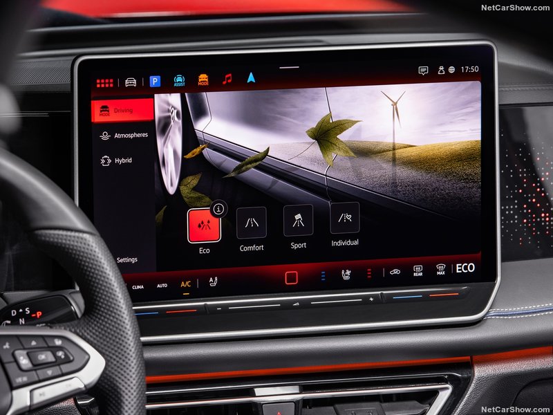 Tüm Tiguan'larda 10.25 inch boyutunda dijital gösterge tablosu görev yapıyor. Aracın orta konsolunda vites butonu görünümünde fakat otomobilin 'atmosferi'ni belirlemeye imkan tanıyan yuvarlak formlu bir buton bulunuyor.