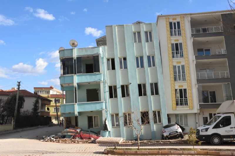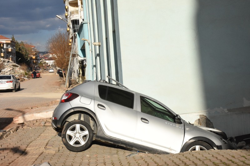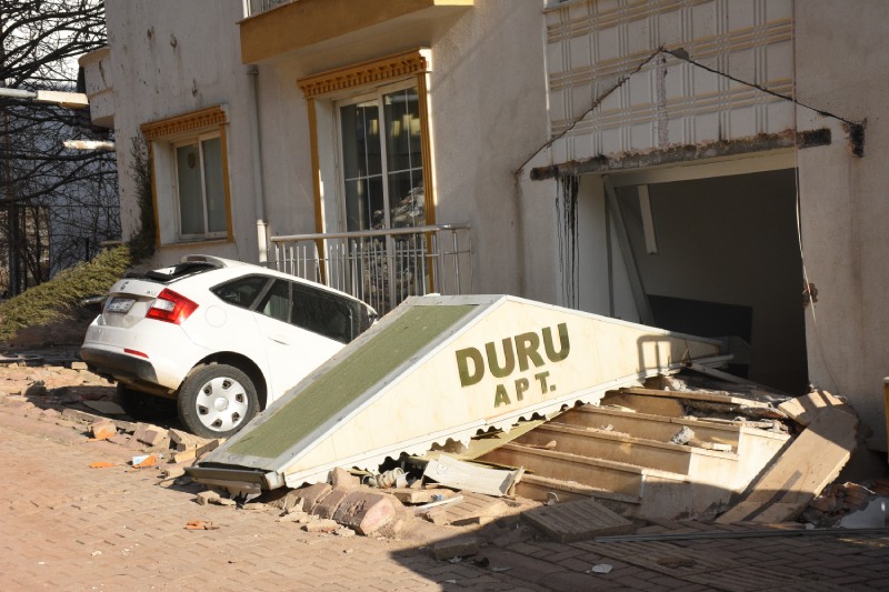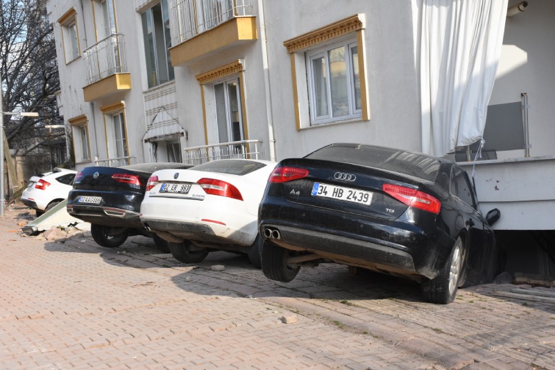 Kahramanmaraş merkezli 6 Şubat'ta meydana gelen depremlerden etkilenen Adıyaman'ın Gölbaşı ilçesinde zemin sıvılaşmasına bağlı giriş katı çöken bir bina, park halindeki 4 otomobilin kaputuna oturdu.