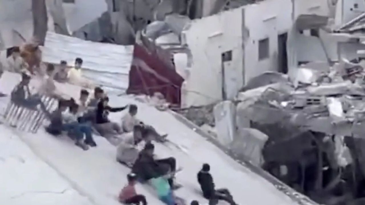 Çocuklar savaşın tüm yıkıcı etkisinin gölgesinde bayram sevincini yıkılan evlerin duvarlarından kayarak yaşadı.