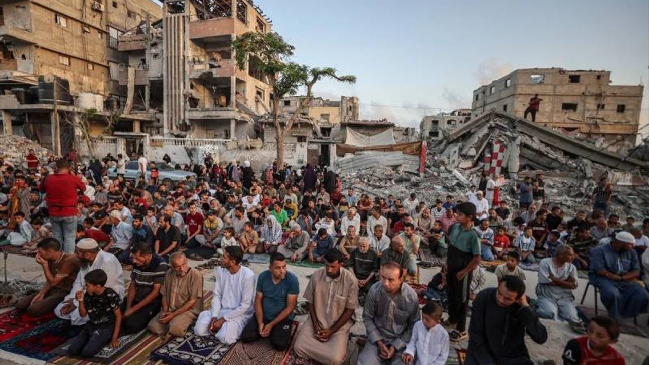 Gazze Şeridi'nin Han Yunus kentindeki Filistinliler, bayram namazını İsrail saldırıları sonucu yıkılan binaların enkazı üzerinde kıldı.