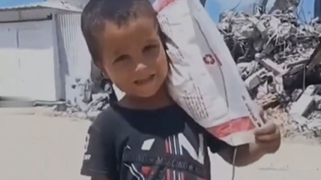 Gazzeli küçük çocuk ailesi için kendinden büyük un çuvalını taşırken görüntülendi. pic.twitter.com/Ow9rsuBoiK