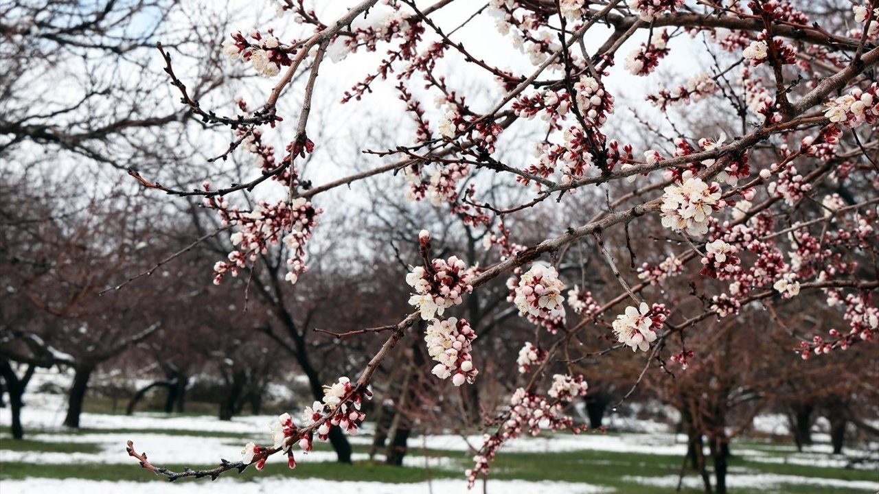 Çiçek açan kayısı ağaçları karla kaplandı