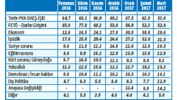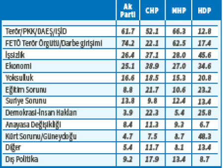 CHP ve HDP seçmeni FETÖ terör örgütü ve darbe girişimini Türkiye'nin önemli sorunları arasında alt sıralarda sayıyor. AK Parti ve MHP seçmeninin verdikleri cevaplar birbirine çok benziyor. CHP seçmeni için en önemli sorun yüzde 52.1 ile PKK ve DAEŞ terörü. Onun ardından yüzde 38.9 ile ekonomi, ve yüzde 37.1 ile işsizlik geliyor. HDP seçmeni 'Kürt Sorunu/Güneydoğu Sorunu, İşsizlik ve Ekonomi cevaplarını Türkiye'nin çözülmesi gereken ilk 3 sorunu olarak söylemiştir. Ak Parti Yüzde 74.1 ile ilk srada FETÖ sorununu, ikinci olarak yüzde 61.7 ile PKK ve DAEŞ'i üçüncüde ise yüzde 26 ile işsizliği en önemli sorun olarak görüyor. MHP'de ise PKK ve DAEŞ terörü yüzde 66.3 ile ilk sırada. İkinci sırada yüzde 62.5 ile FETÖ yer alıyor. Bunları yüzde 28 ile işsizlik takip ediyor.