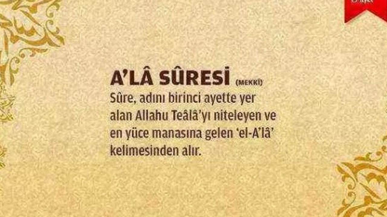 A'la sûresi, Mekke-i mükerremede nazil oldu (indi). On dokuz ayet-i kerîmedir. Birinci ayet-i kerîmedeki (en yüce) manasına gelen "A'la" kelimesi sûreye isim olmuştur. Sûrede, Allahü tealanın her türlü noksanlıklardan tenzîh edilmesi, uzak tutulması, Resûllulah'ın nasîhatlarından kimlerin faydalanıp kurtulacağı, kimlerin de istifade edemeyip, azaba uğrayacağı, insanların dünya hayatını tercih ettikleri halbuki ahiretin dünyadan daha hayırlı olduğu, çünkü dünyanın geçici, ahiretin ise devamlı old uğu ve daha başka hususlar bildirilmektedir.