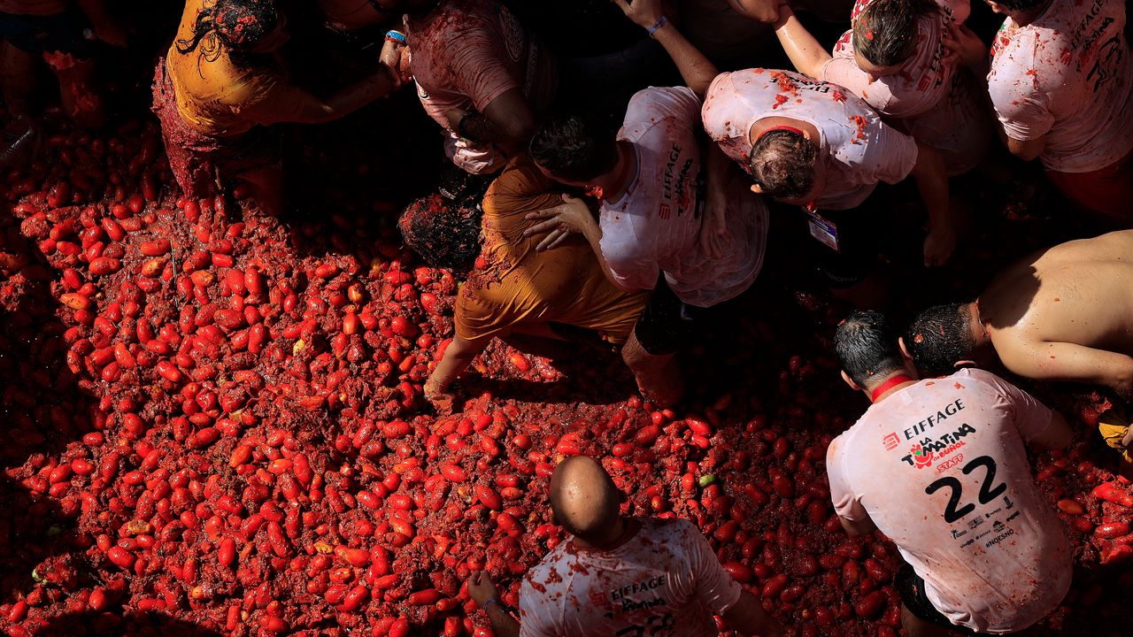 İspanya'da dünyaca tanınmış festivallerinden biri olan ve bu yıl 75'incisi düzenlenen “La Tomatina”ya katılan 20 bin kişi, dağıtılan 130 ton domatesi birbirine attı.