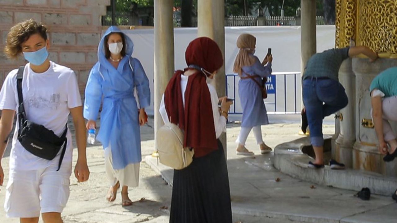 Ayasofya Camii'ni ziyaret etmek isteyenler için, caminin içine şortlu, etekli, başörtüsüz girilmemesi amacıyla girişlerde tulum ve başörtü dağıtımı başladı.
