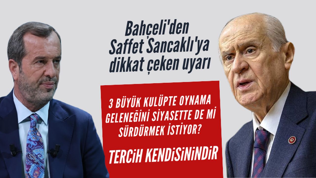 Milliyetçi Hareket Partisi (MHP) Genel Başkanı Devlet Bahçeli, Kocaeli Milletvekili Saffet Sancaklı'nın yeni dönemde Kocaeli'de MHP'ye en az bir belediye verilmesi gerektiğine dair açıklamalarına yönelik ilginç bir yorumda bulundu. Bahçeli, "Futbol hayatında 3 büyük kulüpte oynama geleneğini siyasette de mi sürdürmek istiyor? Tercih kendisinindir" ifadelerini kullandı.