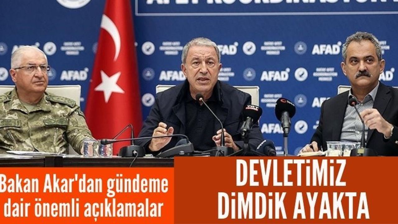 Milli Savunma Bakanı Hulusi Akar, Milli Eğitim Bakanı Mahmut Özer ve diğer ilgililerin de katılımıyla Hatay Afet Koordinasyon Merkezi'nde yaptığı açıklamada, çok sayıda ili etkileyen depremin büyük bir yıkım ve üzüntü kaynağı olduğunu söyledi.